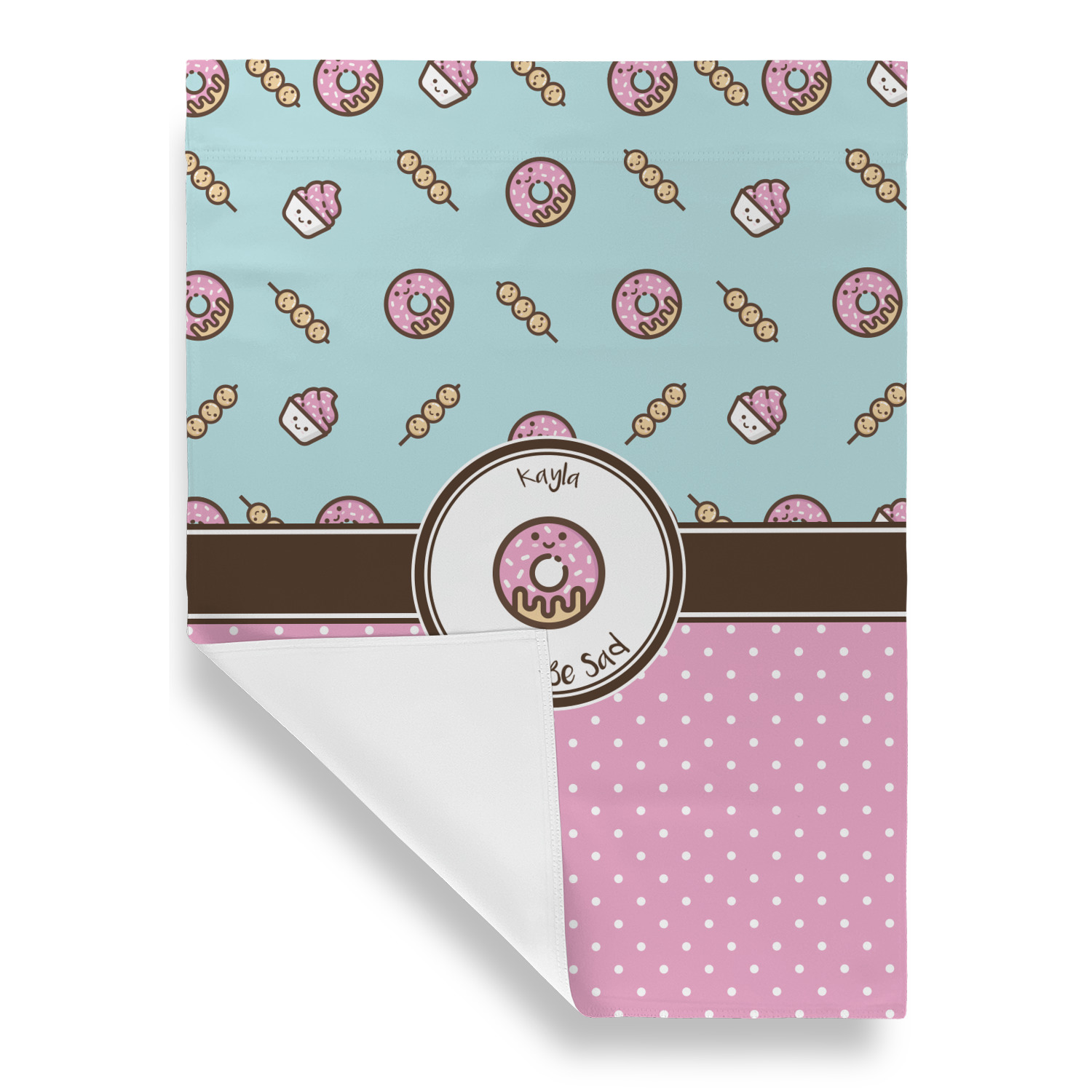 This design is a beautiful light blue/teal and light pink. The top half of the design has a fun pattern with a blue/teal background and pink donuts and other treats. The bottom half is a bright pink polka dot pattern. Each background is divided by a dark brown ribbon. On top of these is a round label with an adorable donut and your personalization right in the middle.
