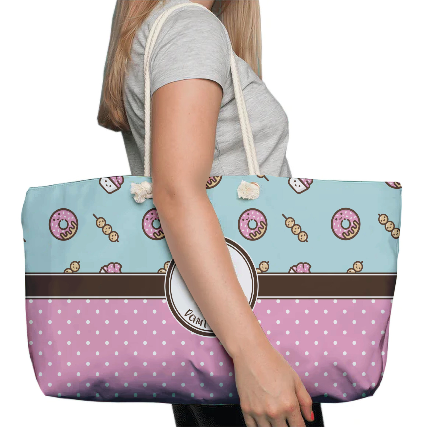 Our oversized weekender tote with rope handles is perfect for your weekend at the beach or on the town. This large tote are 24" W X 13" H, with a 5" gusset and a 27" thick rope handles with a knot that is put through a grommeted brass hole.