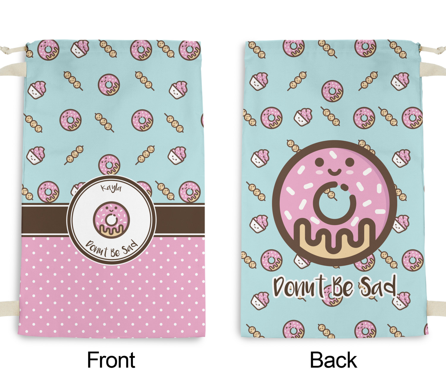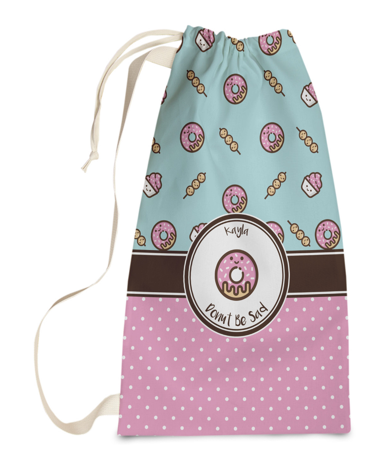 This design is a beautiful light blue/teal and light pink. The top half of the design has a fun pattern with a blue/teal background and pink donuts and other treats. The bottom half is a bright pink polka dot pattern. Each background is divided by a dark brown ribbon. On top of these is a round label with an adorable donut and your personalization right in the middle.