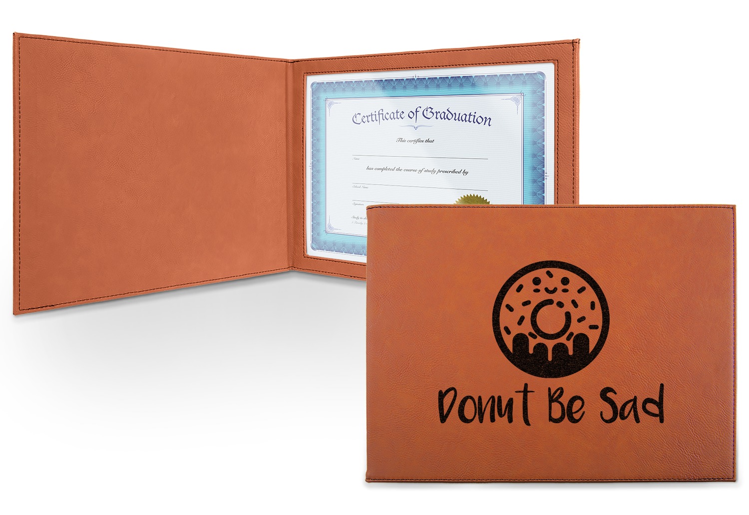 This cognac-colored, leatherette certificate jacket is the ideal way to display or store your hard-earned certificate. When closed, the custom certificate holder measures at 12 by 9 inches. The interior of the certificate cover includes a clear, vinyl window to encase your diploma. The window measures at around 10.5 by 7.5 inches and can accommodate a diploma that measures at up to 8.5 by 11 inches. You can either choose to have your customization laser engraved on the front and interior, or solely the front.