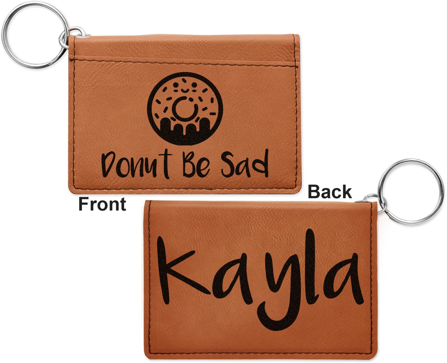 These ID wallet keychains features three pockets on the inside to accommodate your ID and your most frequently used cards. Another pocket occupies the front of the wallet's exterior, and can hold some cash or another card. The wallet is accompanied by a thick metal ring for easy attachment to a belt clip or purse. Each card holder keychain measures at 4.25 by 3 inches and is a beautiful, cognac, medium-brown shade. The personalized monogram, font, or graphic of your choosing is laser engraved into the surface of the wallet, creating a black imprint. We sell these ID wallets in two models: single sided and double sided engraving.