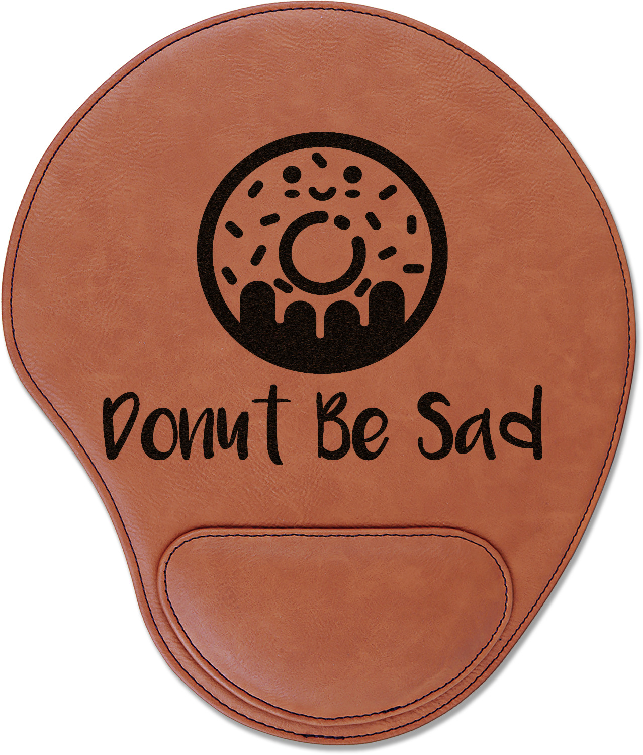 In a rounded shape, this mouse pad is made of a luxurious, cognac-colored leatherette. The nature of this material allows your mouse to glide smoothly across its surface. Strong stitching lines the edges to guarantee stability and strength. As added support for tired wrists, your personalized mouse pad features a supportive wrist rest at its bottom. This model measures at 10.25" x 9", while its wrist pad is approximately 5" x 2.75", with a thickness of 0.75". Your personalized design is laser engraved into the front face of this mouse pad.