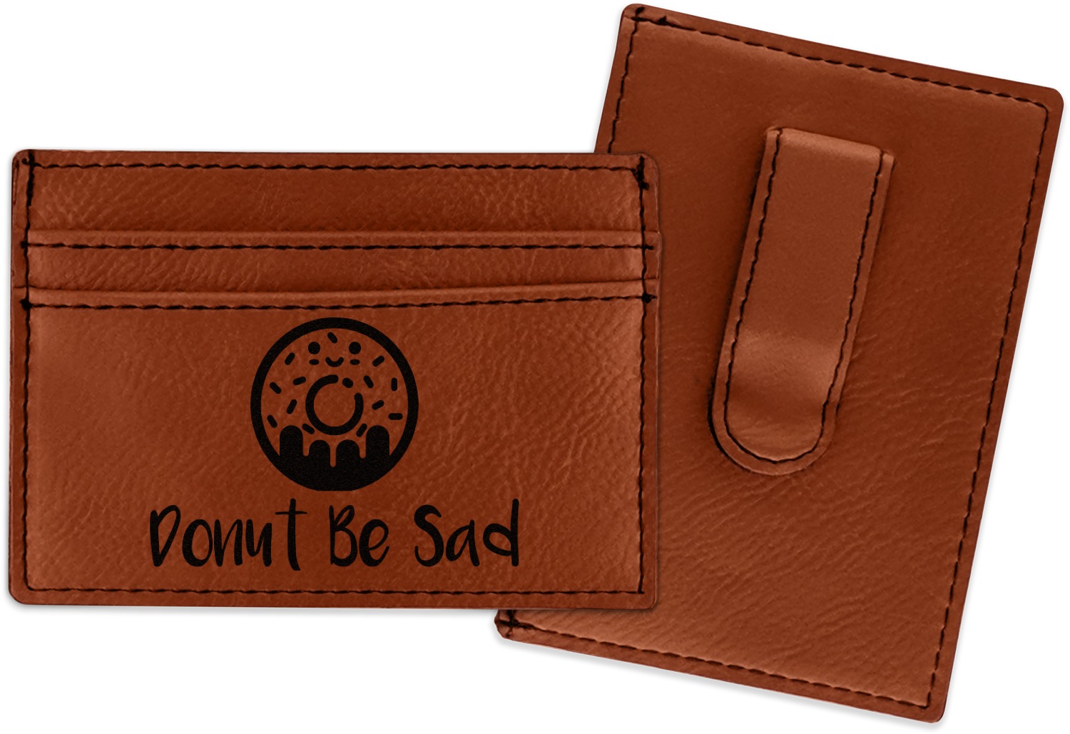 Made from a smooth brown leatherette material, these money clip wallets are the perfect accessory. They measure at approximately 4" x 2.75". On one side there is a money clip where you can slip in your cash. On the other side are three card slots for an ID and credit card or two. The money clip wallet will be laser engraved with your design on the side with the credit card slots. The graphic will come out as a black color.