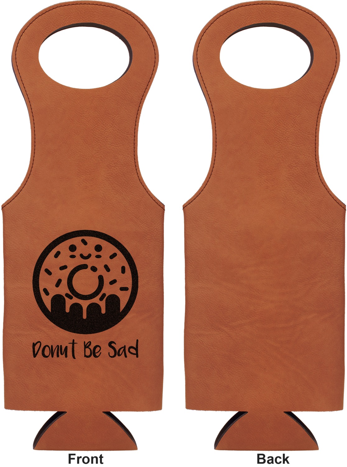 This wine carrier is made from a stunning leatherette, in a cognac-brown color. Strong, black stitching lines the sides of your wine bottle bag and provides extra durability. The interior is lined with a padded, black material to allow for a snug fit once your bottle is placed inside. At the top of this wine gift bag, you'll find two oval shaped handles that elegantly complements the rest of the bag's style. We provide you with the option of laser-engraving the front, or the front and back of your new personalized wine bag!