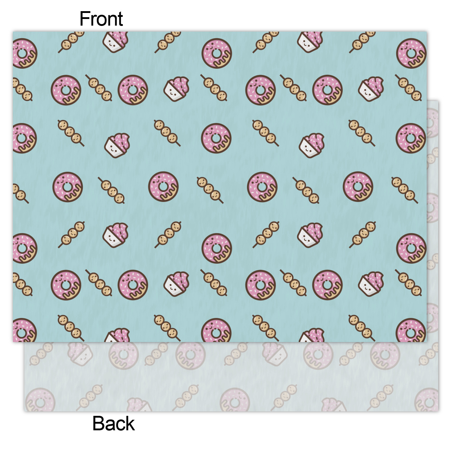 This design is a beautiful light blue/teal and light pink. The top half of the design has a fun pattern with a blue/teal background and pink donuts and other treats. The bottom half is a bright pink polka dot pattern. Each background is divided by a dark brown ribbon. On top of these is a round label with an adorable donut and your personalization right in the middle.