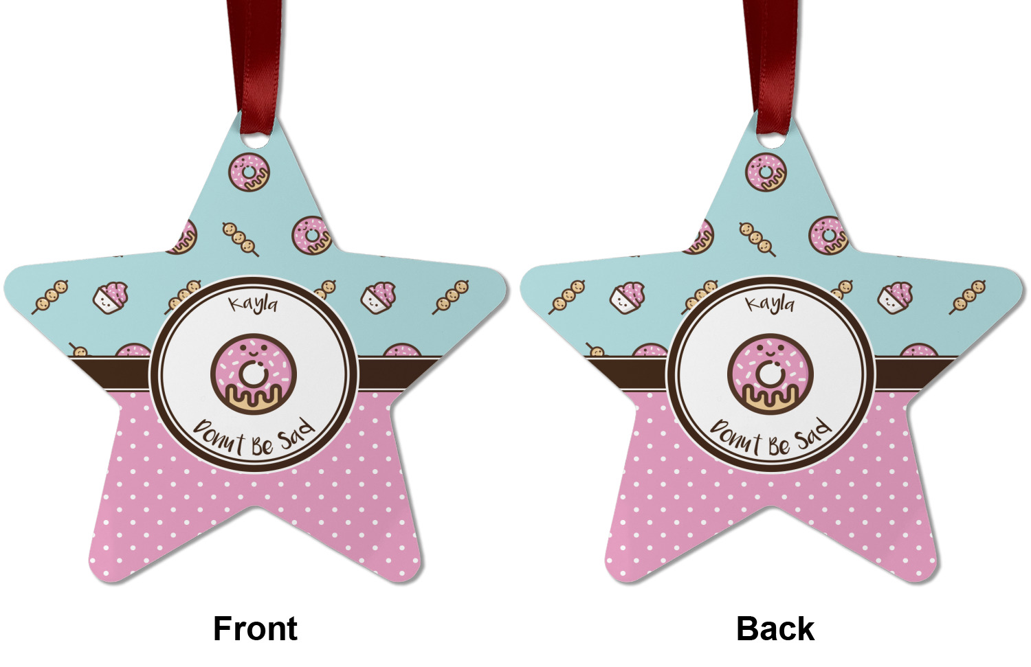 This design is a beautiful light blue/teal and light pink. The top half of the design has a fun pattern with a blue/teal background and pink donuts and other treats. The bottom half is a bright pink polka dot pattern. Each background is divided by a dark brown ribbon. On top of these is a round label with an adorable donut and your personalization right in the middle.