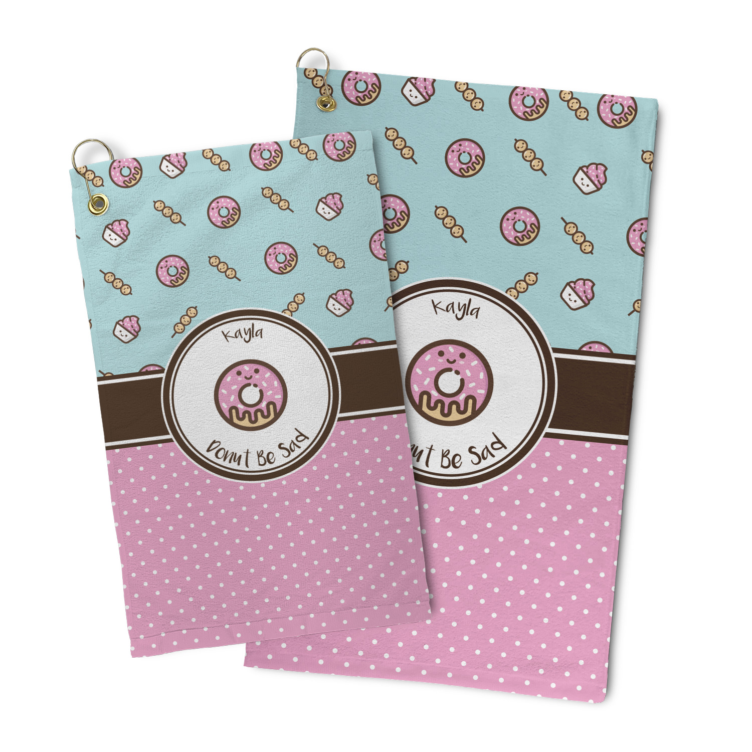 This design is a beautiful light blue/teal and light pink. The top half of the design has a fun pattern with a blue/teal background and pink donuts and other treats. The bottom half is a bright pink polka dot pattern. Each background is divided by a dark brown ribbon. On top of these is a round label with an adorable donut and your personalization right in the middle.