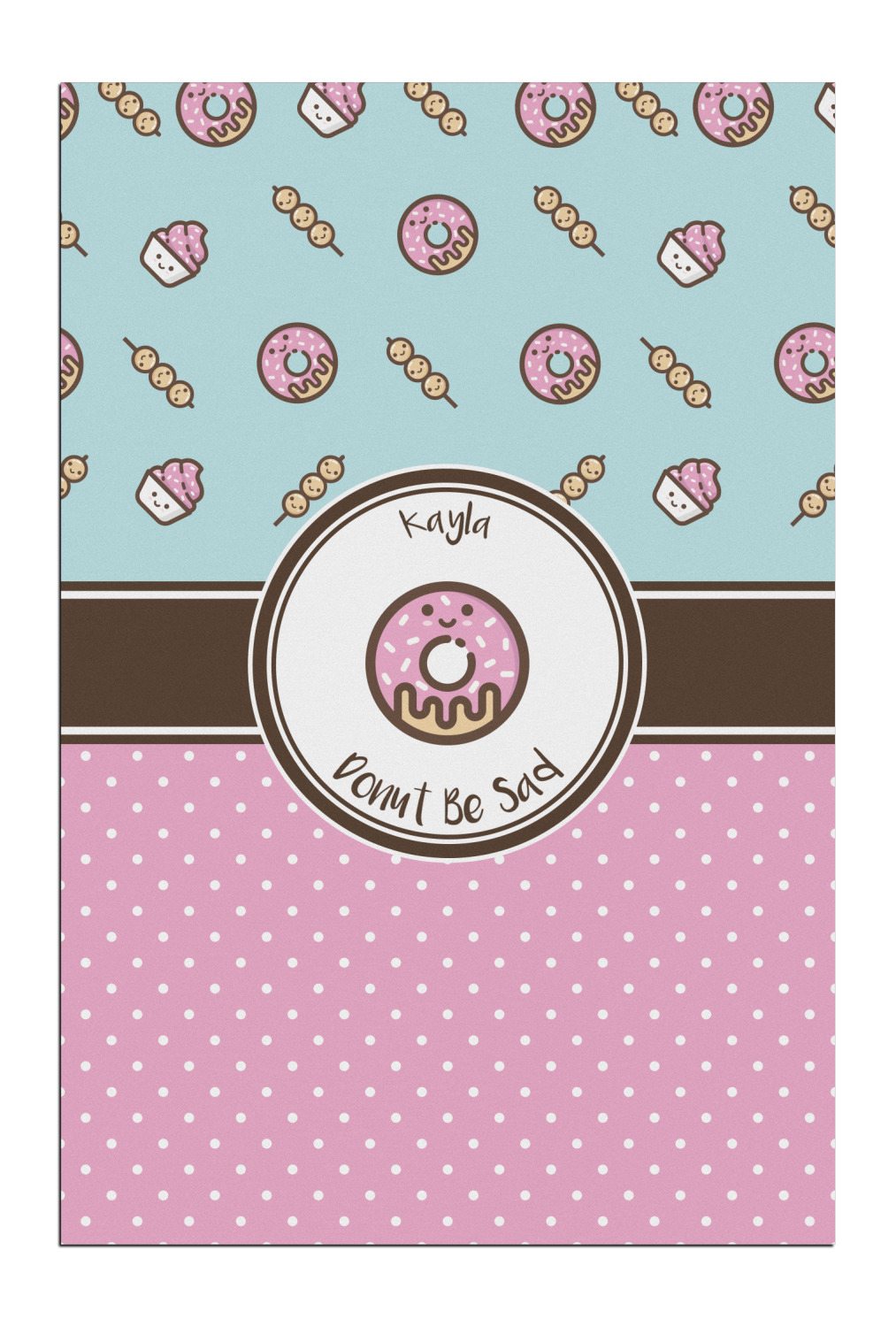 This design is a beautiful light blue/teal and light pink. The top half of the design has a fun pattern with a blue/teal background and pink donuts and other treats. The bottom half is a bright pink polka dot pattern. Each background is divided by a dark brown ribbon. On top of these is a round label with an adorable donut and your personalization right in the middle.