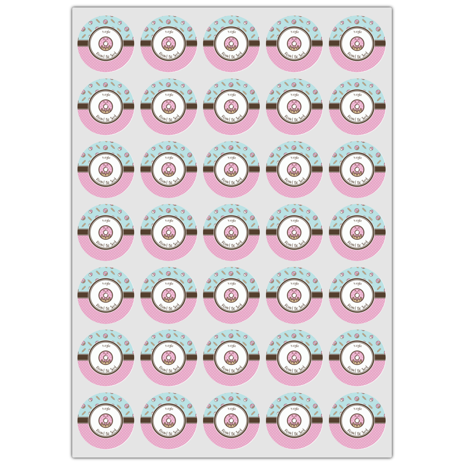 This design is a beautiful light blue/teal and light pink. The top half of the design has a fun pattern with a blue/teal background and pink donuts and other treats. The bottom half is a bright pink polka dot pattern. Each background is divided by a dark brown ribbon. On top of these is a round label with an adorable donut and your personalization right in the middle.