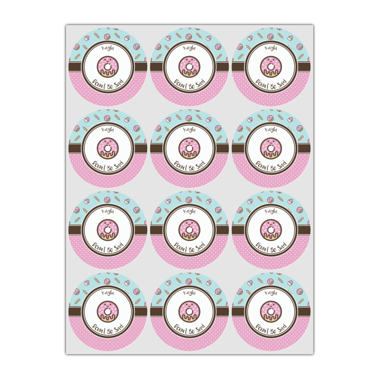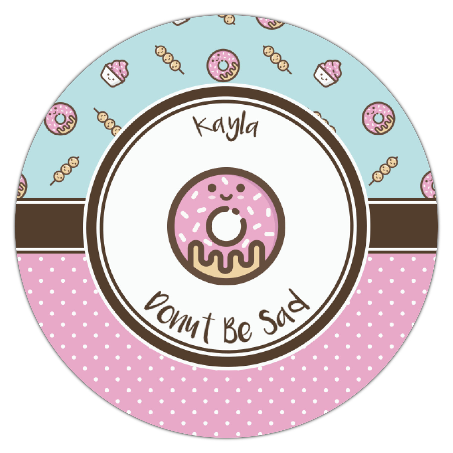 This design is a beautiful light blue/teal and light pink. The top half of the design has a fun pattern with a blue/teal background and pink donuts and other treats. The bottom half is a bright pink polka dot pattern. Each background is divided by a dark brown ribbon. On top of these is a round label with an adorable donut and your personalization right in the middle.