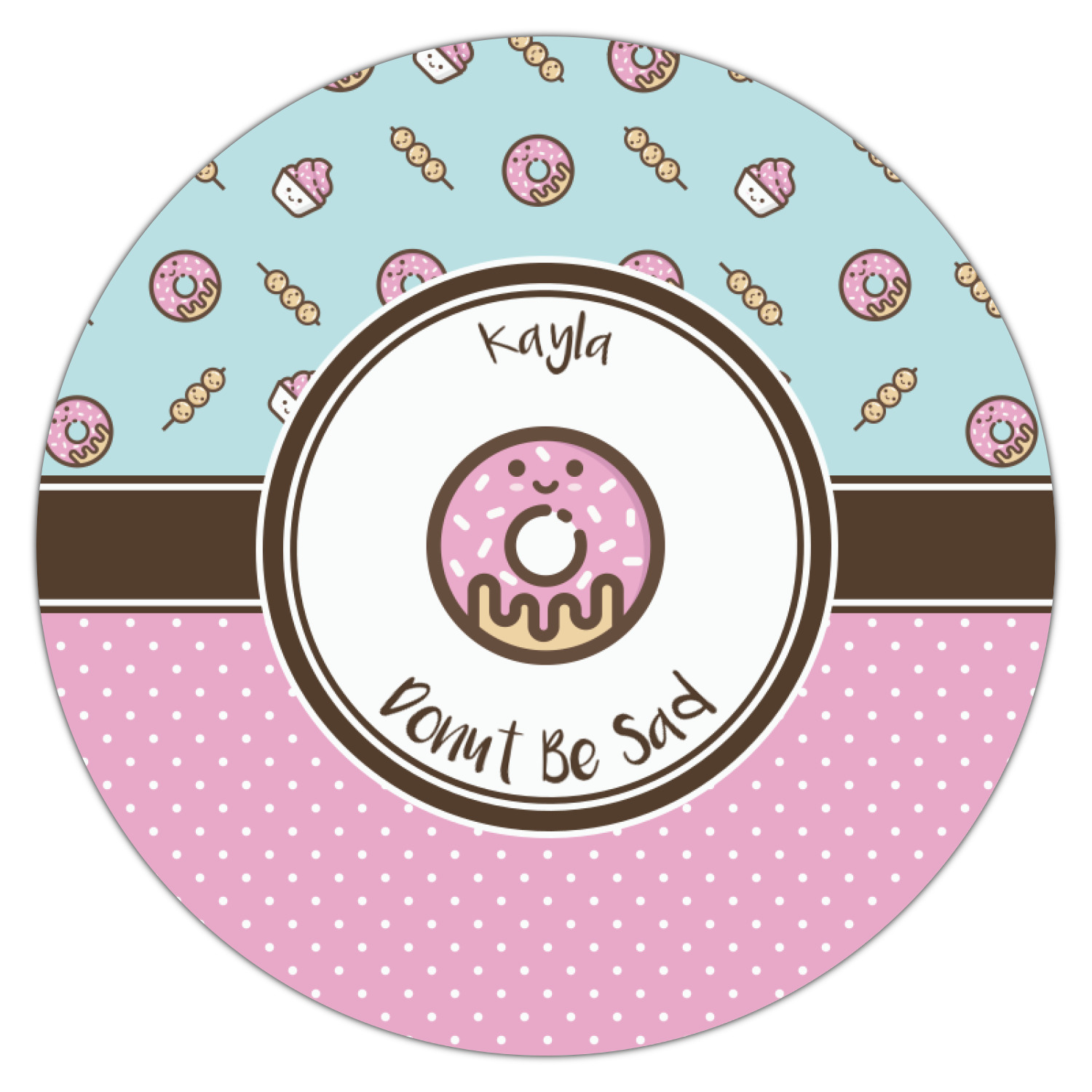 This design is a beautiful light blue/teal and light pink. The top half of the design has a fun pattern with a blue/teal background and pink donuts and other treats. The bottom half is a bright pink polka dot pattern. Each background is divided by a dark brown ribbon. On top of these is a round label with an adorable donut and your personalization right in the middle.