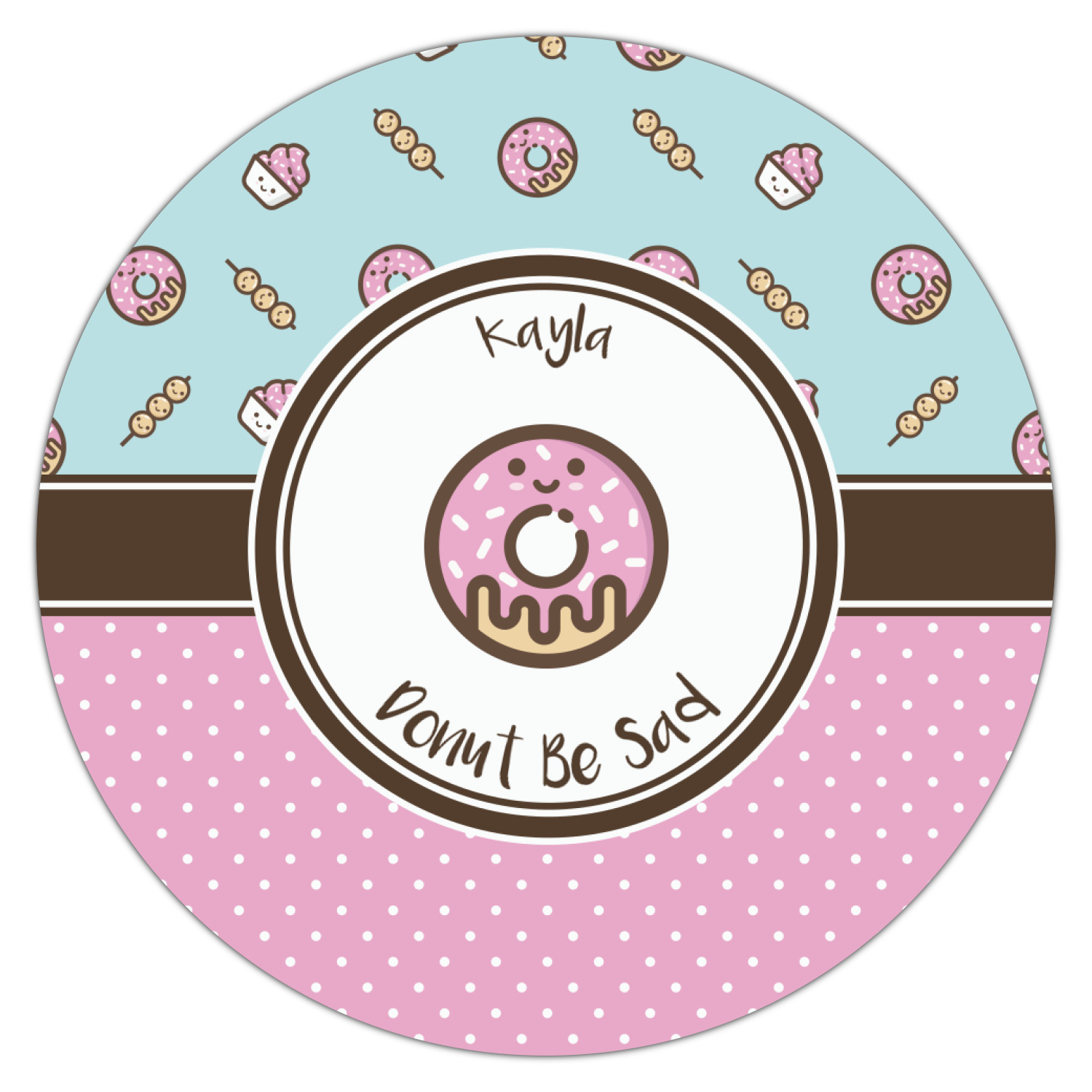 This design is a beautiful light blue/teal and light pink. The top half of the design has a fun pattern with a blue/teal background and pink donuts and other treats. The bottom half is a bright pink polka dot pattern. Each background is divided by a dark brown ribbon. On top of these is a round label with an adorable donut and your personalization right in the middle.