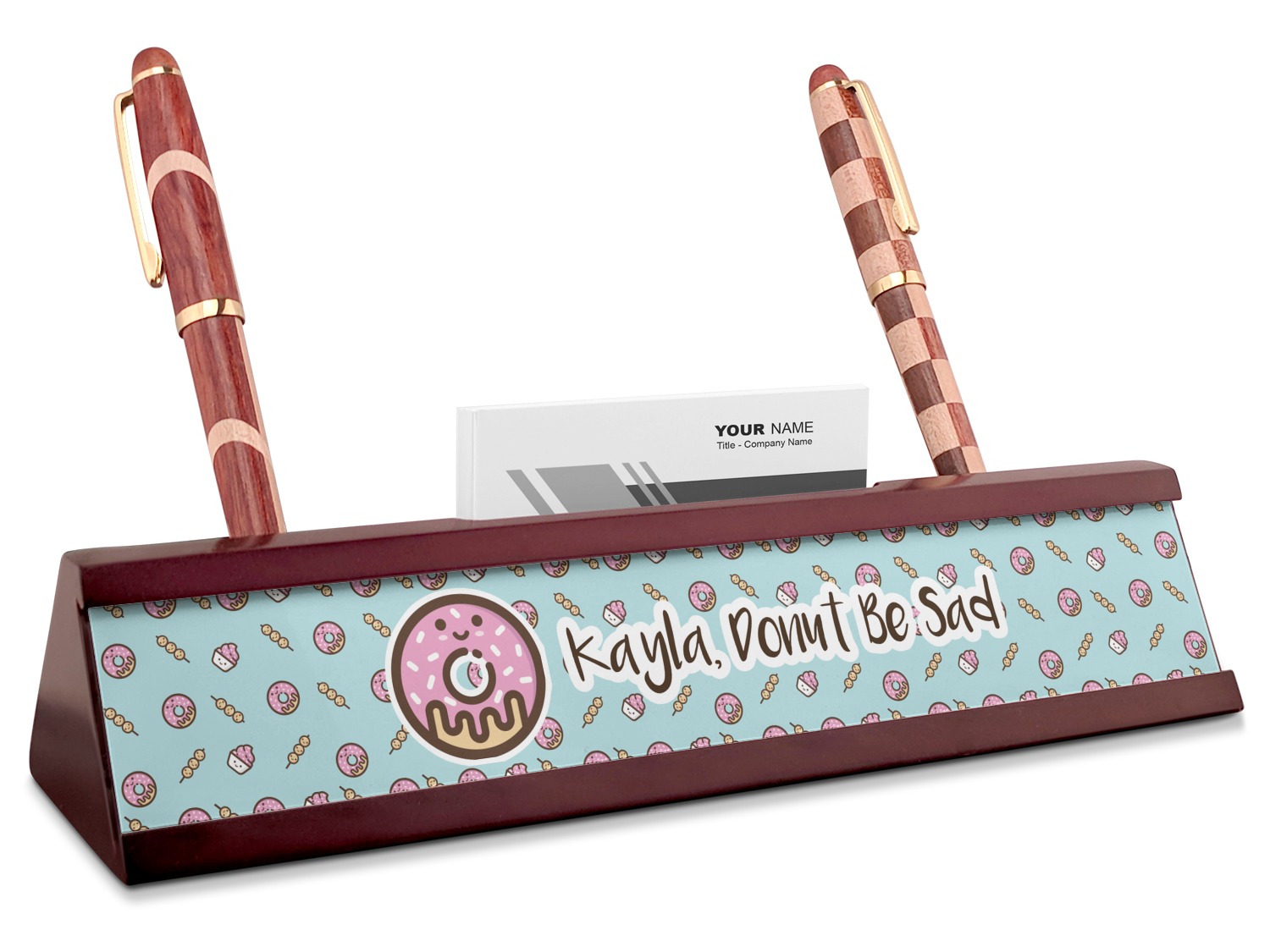 Your desk name plates are crafted from a high-quality, dark-cherry mahogany. At approximately 9.5 by 1.875 by 2.5 inches, this name plaque will fit perfectly, front and center, on your desk. Your customization spans across the entire face of the nameplate. Behind the nameplate lies a skinny slot that can fit approximately 15, traditionally-sized, business cards. You can also store your writing utensils on either side of this custom desk name plate.