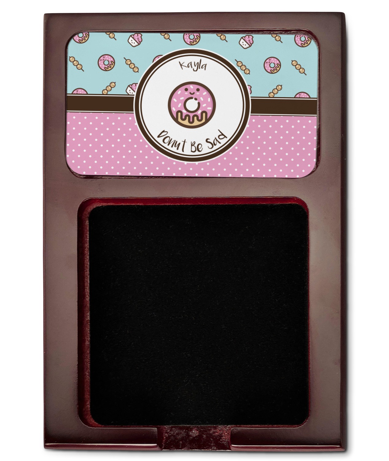 Crafted from a fine mahogany, this post it note holder is in the shade of a dark, cherry color. The dispenser itself is about 4.25 by 6.25 by 0.75 inches. You can place your 3 by 3 inch sticky notes in the indentation below the nameplate. We print your customization onto the nameplate that rests above the velvety indentation.