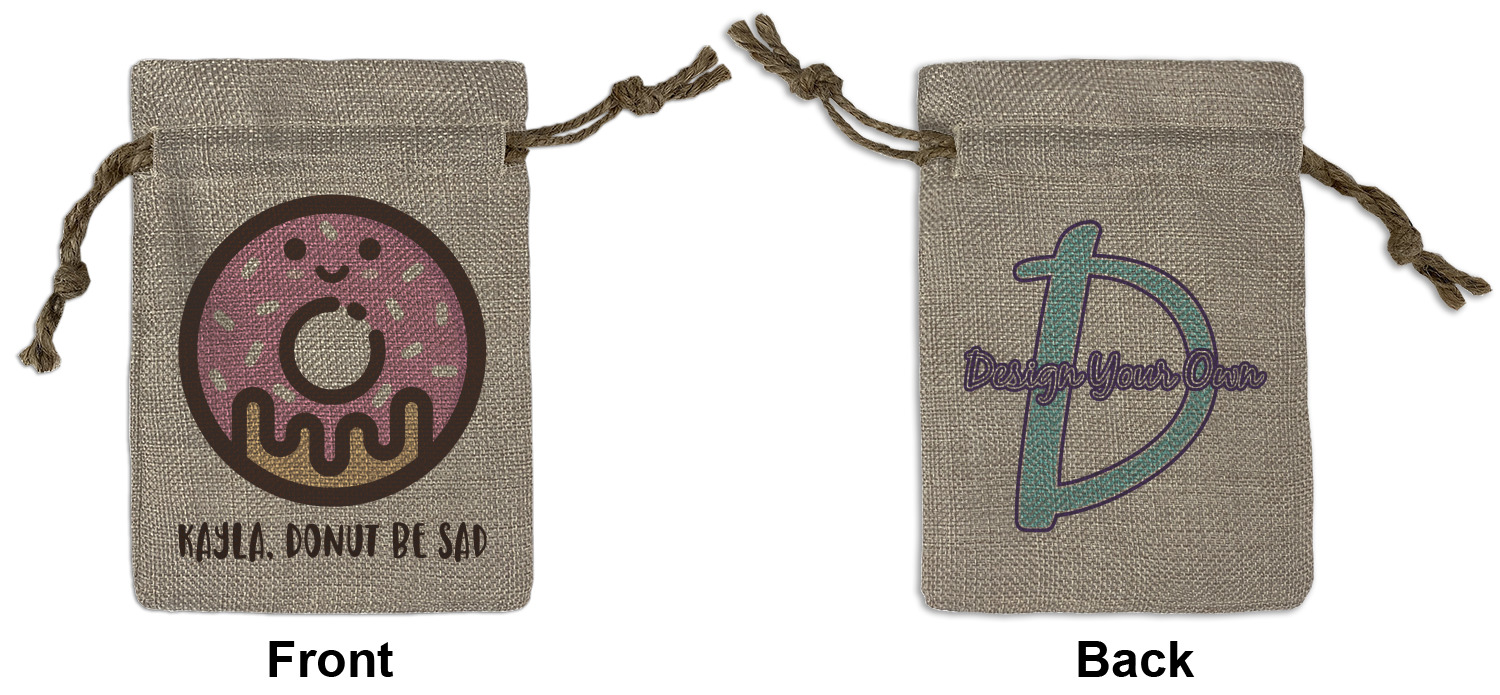 We sell our Burlap Gift Bags in 3 variant sized bags. Made with burlap polyester, each personalized bag can be secured with a twine drawstring pull. Your custom design is available to print on one side or both sides - completely up to you! The sizes of the bags measure approximately 4.5" x 6.5" for the smallest size, 6.5" x 8.0" for the medium size, and 6.5" x 13.5" for the large-sized bag.