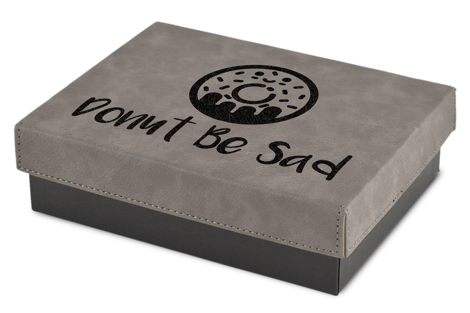 These gift boxes are available in 3 different sizes to accommodate various sized gifts. Available in gray as a neutral color for any occasion as well as to showcase your design boldly. Engraved with a laser this high quality paper board and faux leather gift box is unique and makes any gift stand out.
