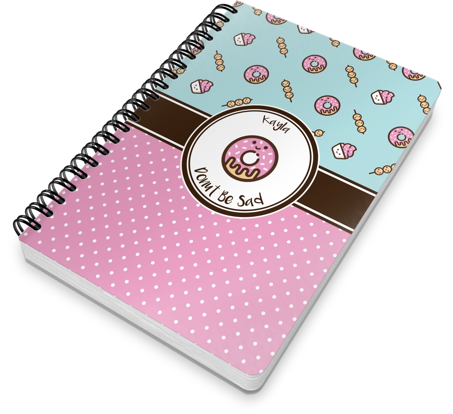 This spiral notebook includes 75 sheets of thick, ruled paper. The front and back of this custom notebook is made of a robust, laminate, plastic covering. We print your personalization on these two panels, underneath a glossy finish, which emphasizes the colors of your design. The two panels and the sheets of paper are held together by a sturdy, black coil. The paper within your bound notebook is perforated for easy, clean tearing.