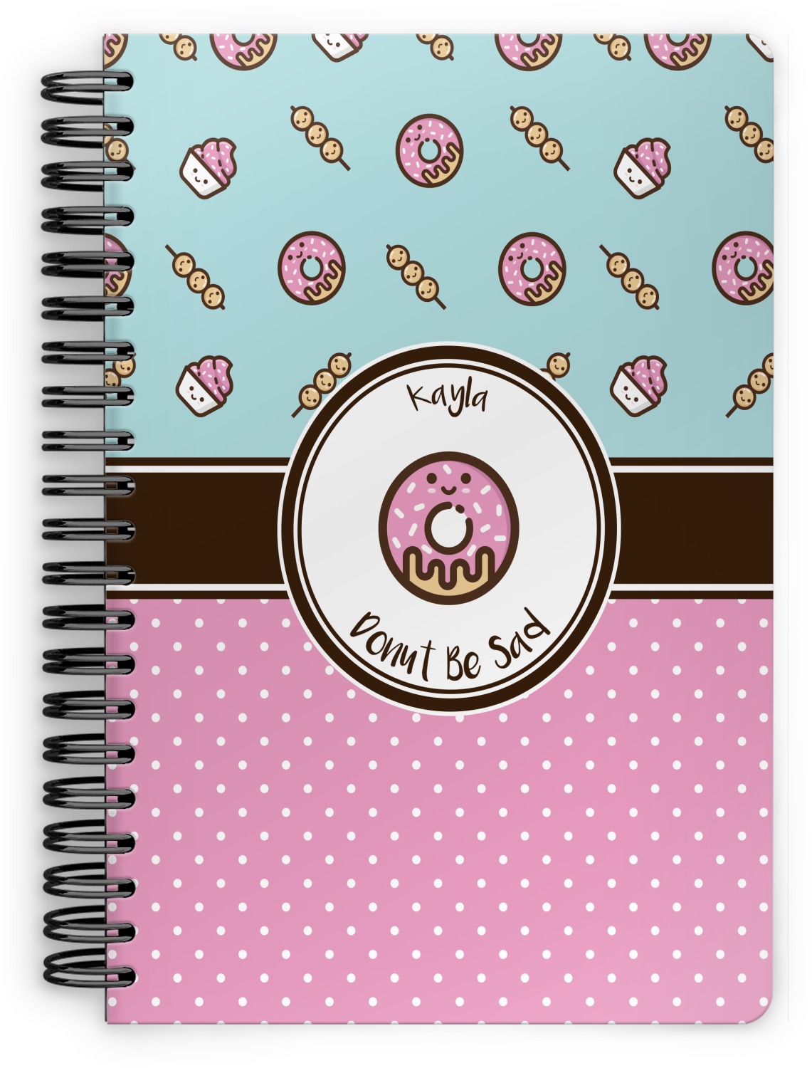 This design is a beautiful light blue/teal and light pink. The top half of the design has a fun pattern with a blue/teal background and pink donuts and other treats. The bottom half is a bright pink polka dot pattern. Each background is divided by a dark brown ribbon. On top of these is a round label with an adorable donut and your personalization right in the middle.