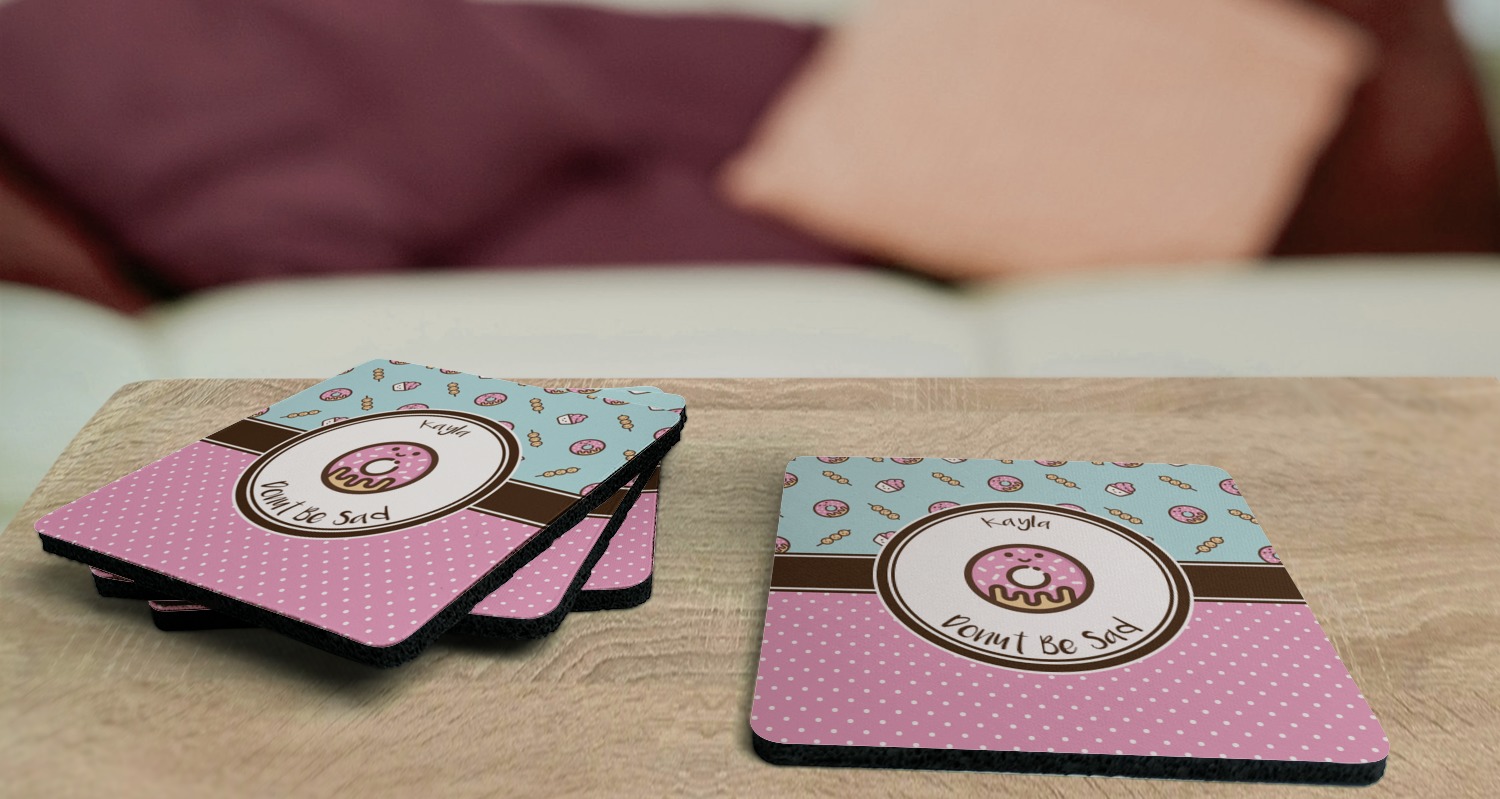 These drink coasters have a smooth, polyester top and a textured, rubber backing on its bottom. The non-slip rubber backing underneath works to keep any spills at bay. At 4 by 4 by 0.25 inches thick, these custom coasters are a suitable size for most drinkware. Your personalization is displayed atop the face of the cup coaster. We sell these rubber coasters in two different shapes: square and round. You can buy each shape as singulars or as a set of 4.