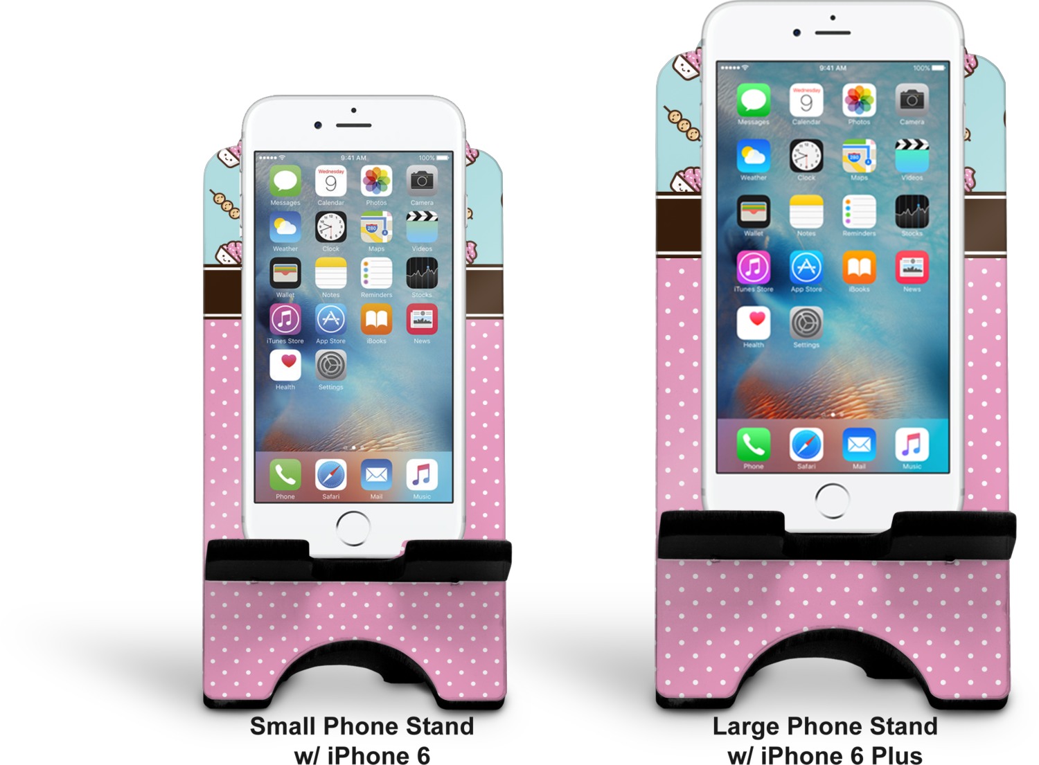To meet your needs, we offer four variations of this IPhone stand. The backboard of the first version is shaped as a plain, yet sleek rectangle, and is available in two sizes. Our smaller size is approximately 4 by 3.25 by 7 inches, while the larger model is 4 by 3.77 by 8.5 inches. Alongside this model, we also provide you with a more decorative option. The upper part of our second version features a curved edge, for a classy, suave appearance. This phone holder is also sold in two sizes: a smaller version, which is 4 by 3.25 by 7 inches, and our larger model, which is 4 by 3.77 by 8.5 inches. Both models will support large phones, but the larger model is better if you wish to proudly display your personalized design.