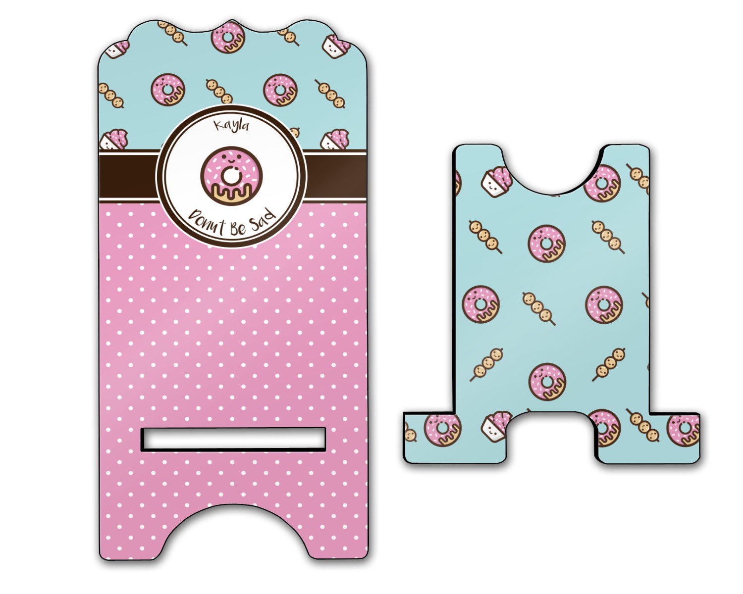This design is a beautiful light blue/teal and light pink. The top half of the design has a fun pattern with a blue/teal background and pink donuts and other treats. The bottom half is a bright pink polka dot pattern. Each background is divided by a dark brown ribbon. On top of these is a round label with an adorable donut and your personalization right in the middle.