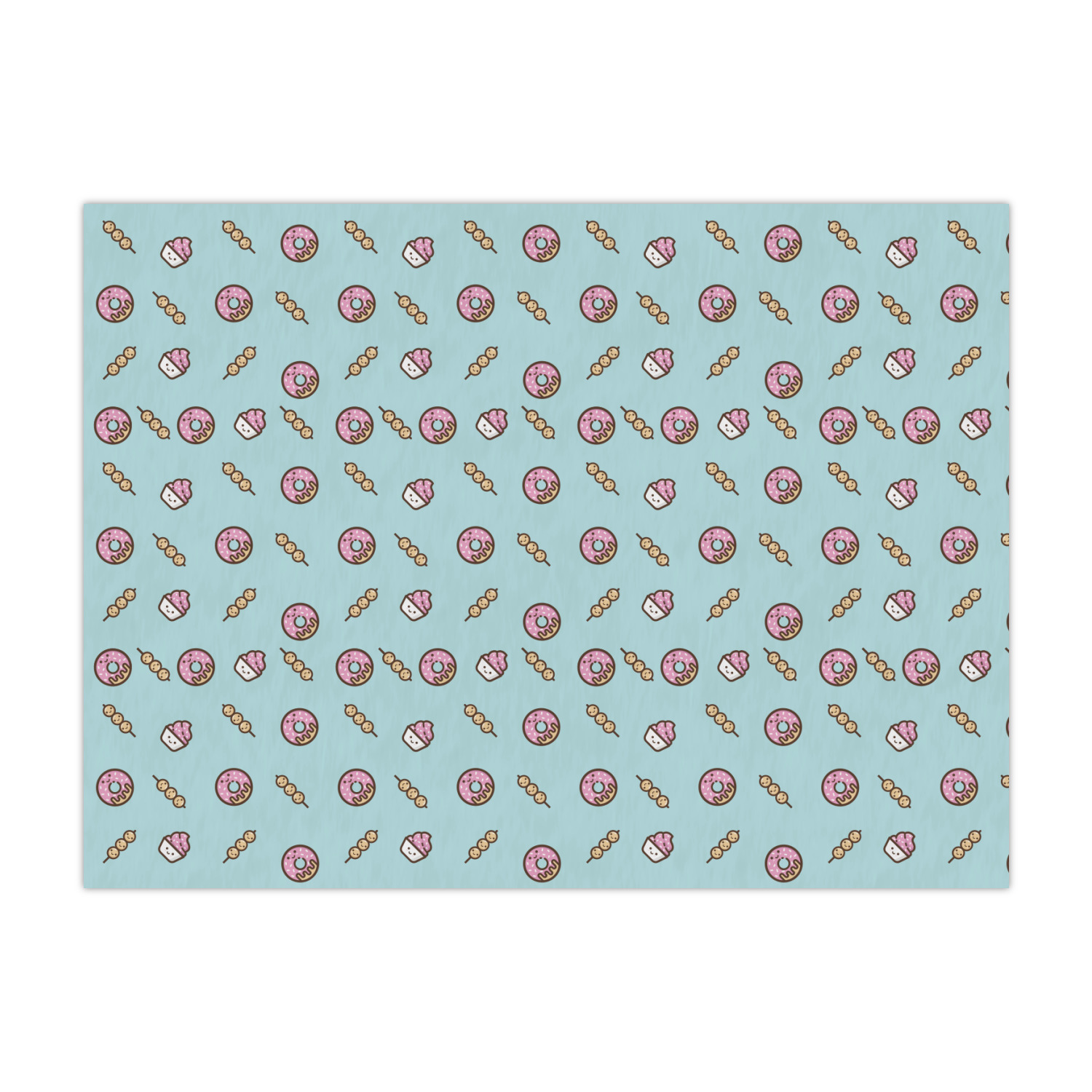This design is a beautiful light blue/teal and light pink. The top half of the design has a fun pattern with a blue/teal background and pink donuts and other treats. The bottom half is a bright pink polka dot pattern. Each background is divided by a dark brown ribbon. On top of these is a round label with an adorable donut and your personalization right in the middle.