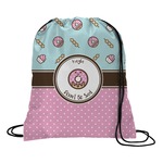 This design is a beautiful light blue/teal and light pink. The top half of the design has a fun pattern with a blue/teal background and pink donuts and other treats. The bottom half is a bright pink polka dot pattern. Each background is divided by a dark brown ribbon. On top of these is a round label with an adorable donut and your personalization right in the middle.