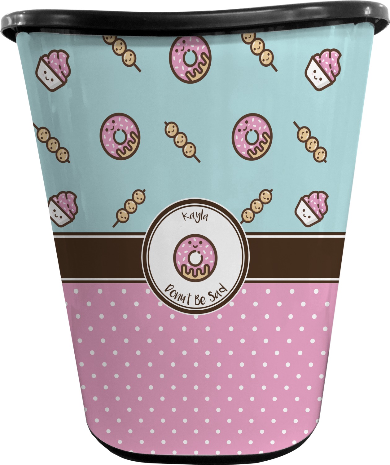 This design is a beautiful light blue/teal and light pink. The top half of the design has a fun pattern with a blue/teal background and pink donuts and other treats. The bottom half is a bright pink polka dot pattern. Each background is divided by a dark brown ribbon. On top of these is a round label with an adorable donut and your personalization right in the middle.
