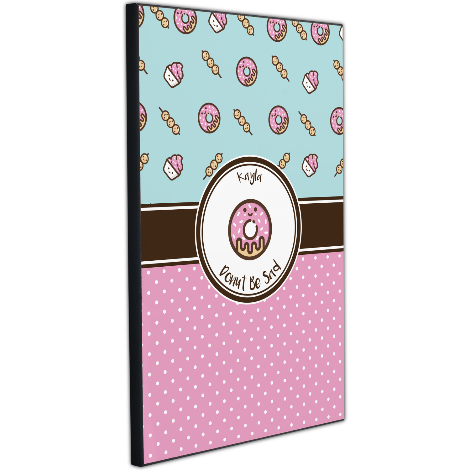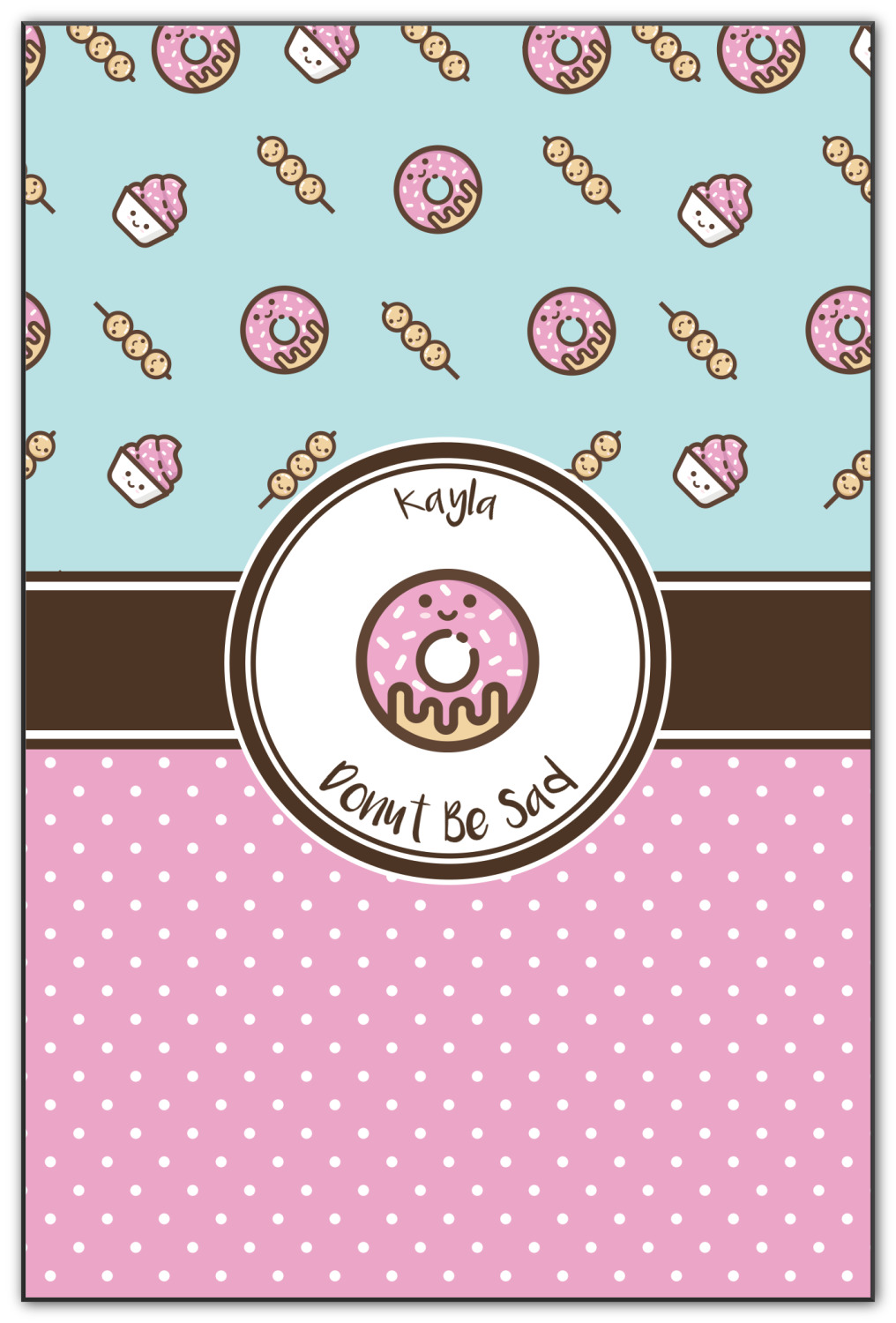 This design is a beautiful light blue/teal and light pink. The top half of the design has a fun pattern with a blue/teal background and pink donuts and other treats. The bottom half is a bright pink polka dot pattern. Each background is divided by a dark brown ribbon. On top of these is a round label with an adorable donut and your personalization right in the middle.