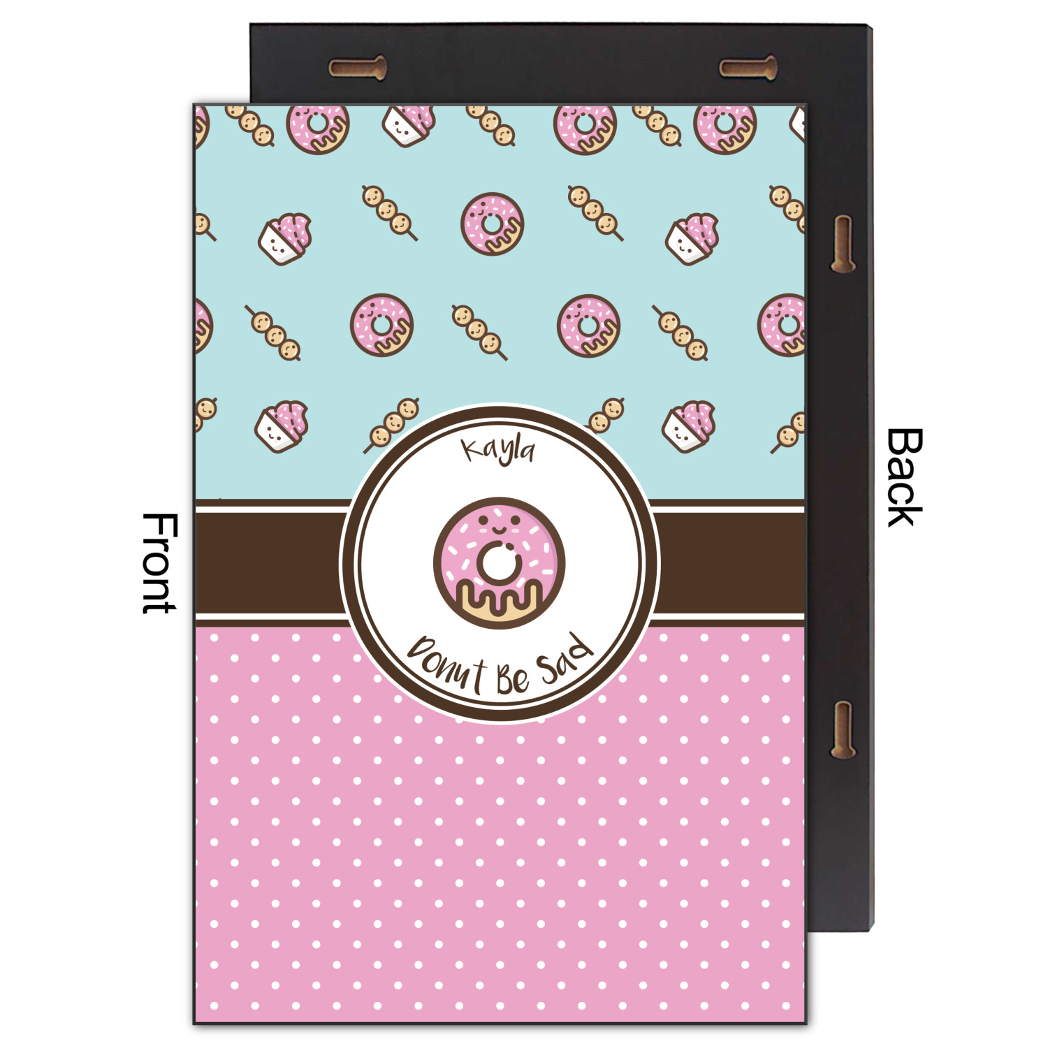This design is a beautiful light blue/teal and light pink. The top half of the design has a fun pattern with a blue/teal background and pink donuts and other treats. The bottom half is a bright pink polka dot pattern. Each background is divided by a dark brown ribbon. On top of these is a round label with an adorable donut and your personalization right in the middle.