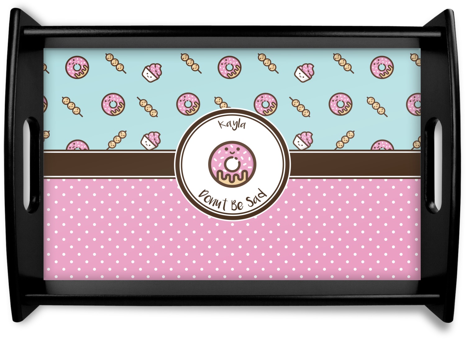 This serving tray with handles features square edges and two rounded sides, creating a very modern look. Each side is fabricated from a beautifully cut, natural wood. The bottom of the interior of the tray displays your customized design in bright, vibrant color. The tray is sold in both a black color and a natural wood look. Each variation of the wood serving tray has two sizes: Small, which is 14" x 10" x 2.25", and Large, which is 19.5" x 13.5" x 2.75".