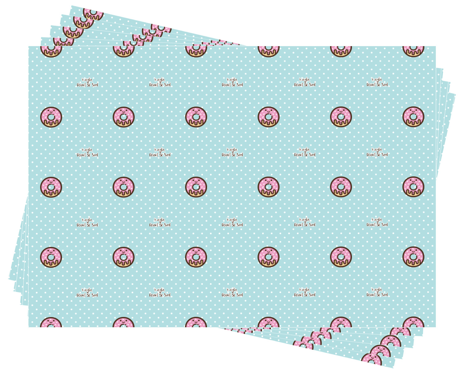 This design is a beautiful light blue/teal and light pink. The top half of the design has a fun pattern with a blue/teal background and pink donuts and other treats. The bottom half is a bright pink polka dot pattern. Each background is divided by a dark brown ribbon. On top of these is a round label with an adorable donut and your personalization right in the middle.