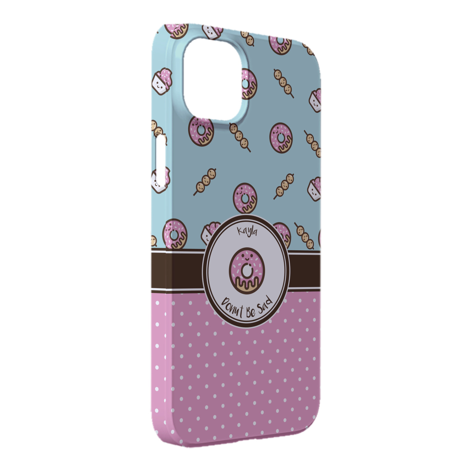 This design is a beautiful light blue/teal and light pink. The top half of the design has a fun pattern with a blue/teal background and pink donuts and other treats. The bottom half is a bright pink polka dot pattern. Each background is divided by a dark brown ribbon. On top of these is a round label with an adorable donut and your personalization right in the middle.