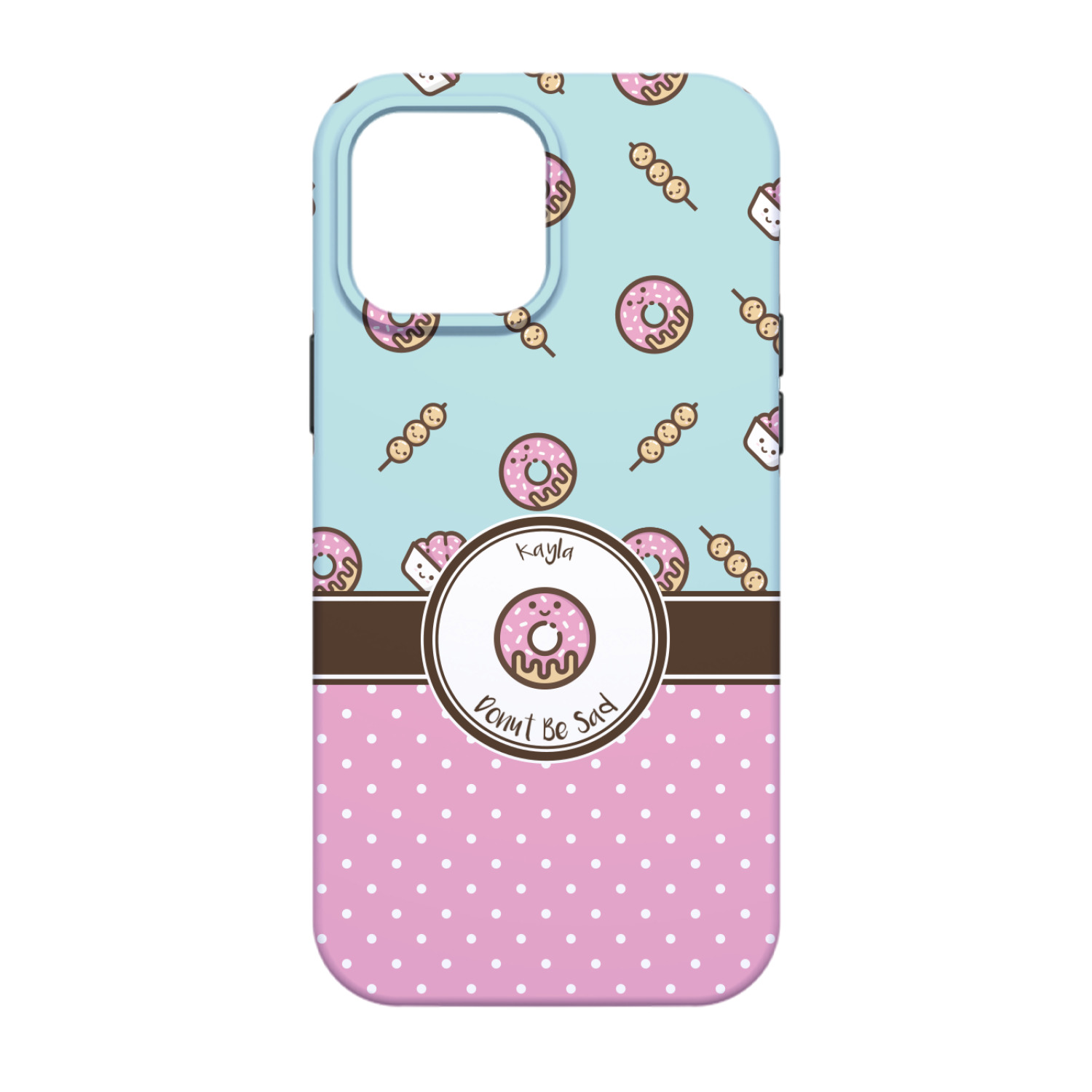 This design is a beautiful light blue/teal and light pink. The top half of the design has a fun pattern with a blue/teal background and pink donuts and other treats. The bottom half is a bright pink polka dot pattern. Each background is divided by a dark brown ribbon. On top of these is a round label with an adorable donut and your personalization right in the middle.