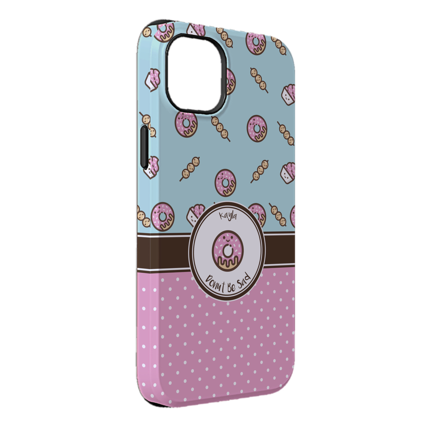 This design is a beautiful light blue/teal and light pink. The top half of the design has a fun pattern with a blue/teal background and pink donuts and other treats. The bottom half is a bright pink polka dot pattern. Each background is divided by a dark brown ribbon. On top of these is a round label with an adorable donut and your personalization right in the middle.