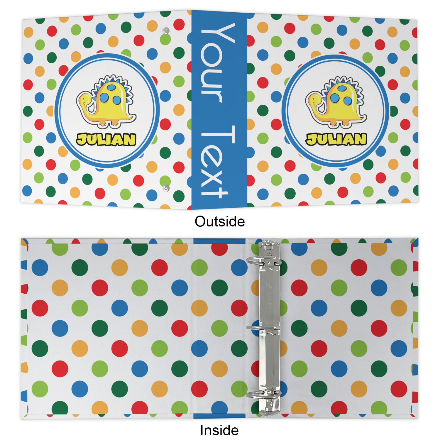 Made from a sturdy cardboard base with a full high quality canvas textured vinyl wrap with the design of your choice. Unlike our standard 3-ring binder with the full wrap design your artwork wraps from the front and back and into the inside of the binder.