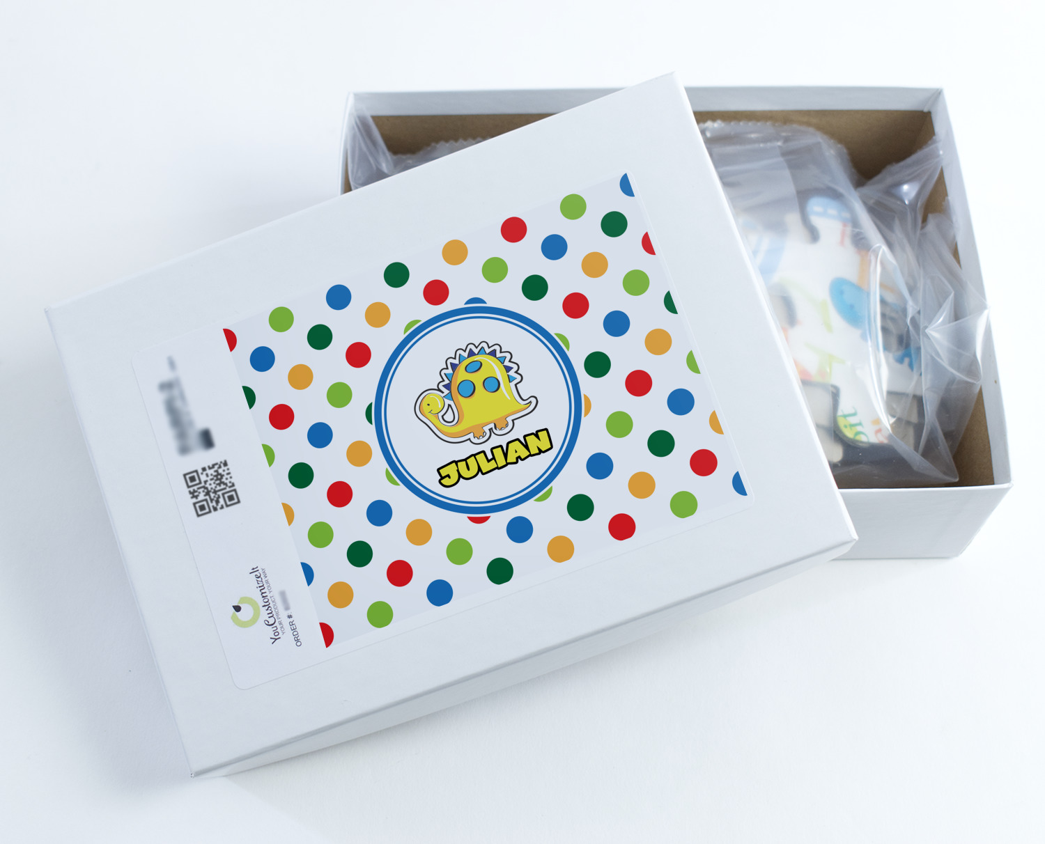 A white label trimmed in coordinating blue showcases a cute yellow dinosaur. Add personalization of your choice for this special pattern.
