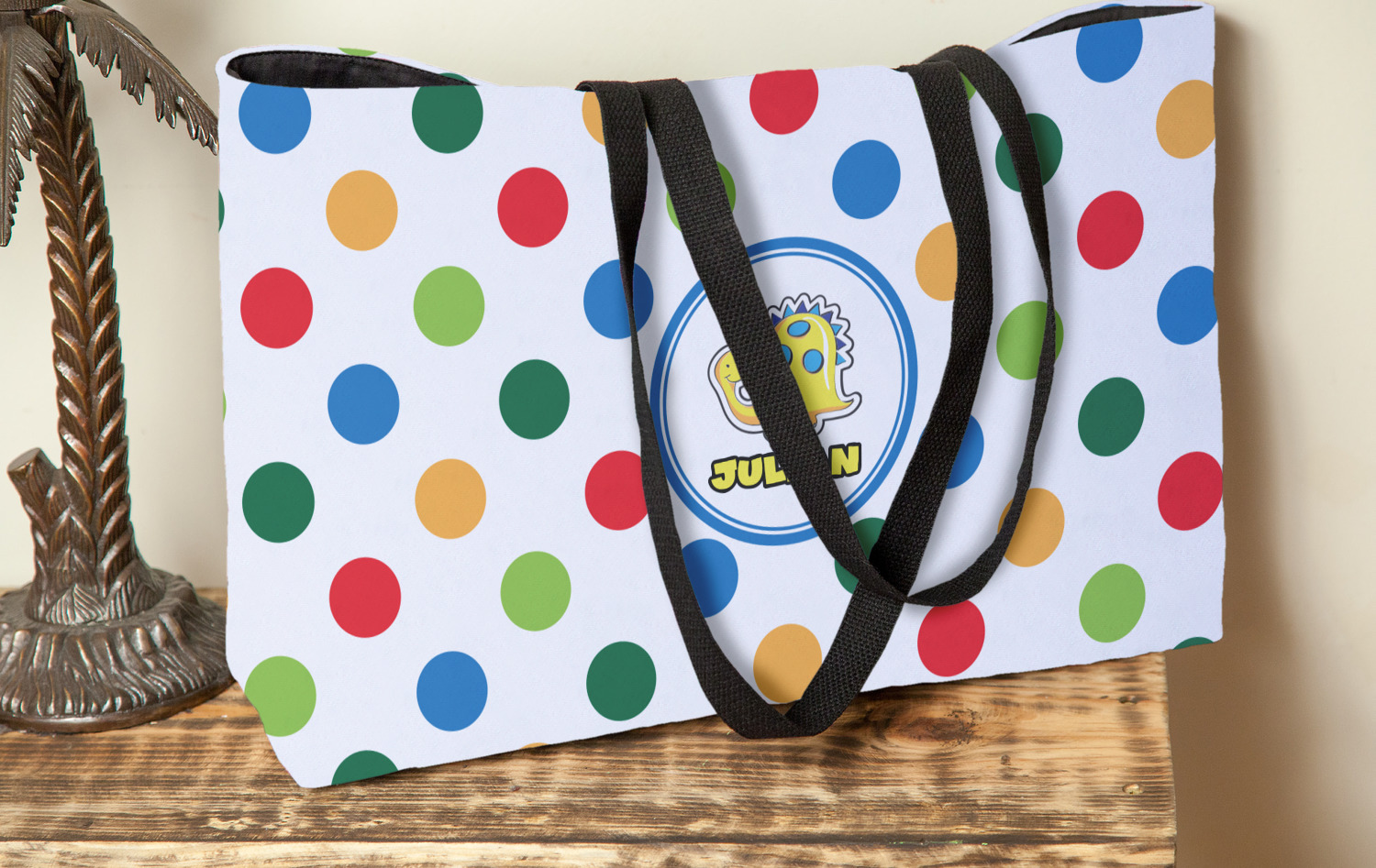 These beach totes are handmade here in the USA. Fabric is printed with your design. The tote is then sewn from the fabric pieces, lining and handles added.