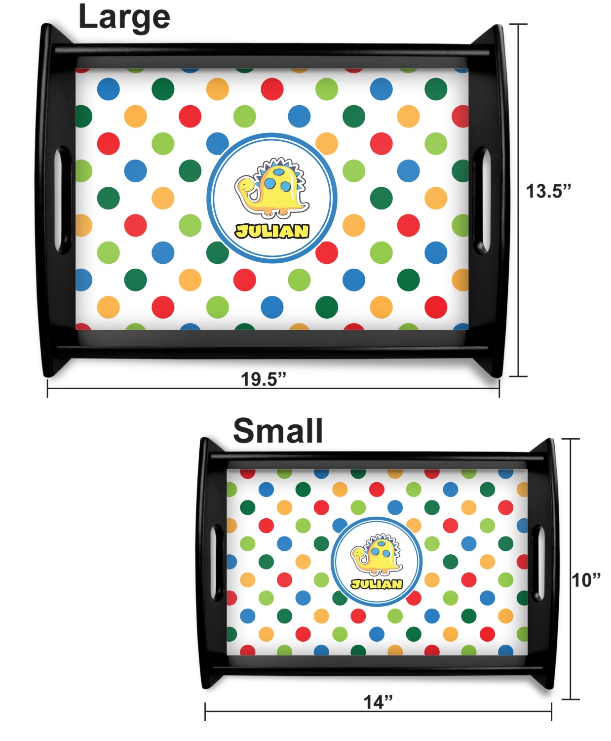This serving tray with handles features square edges and two rounded sides, creating a very modern look. Each side is fabricated from a beautifully cut, natural wood. The bottom of the interior of the tray displays your customized design in bright, vibrant color. The tray is sold in both a black color and a natural wood look. Each variation of the wood serving tray has two sizes: Small, which is 14" x 10" x 2.25", and Large, which is 19.5" x 13.5" x 2.75".