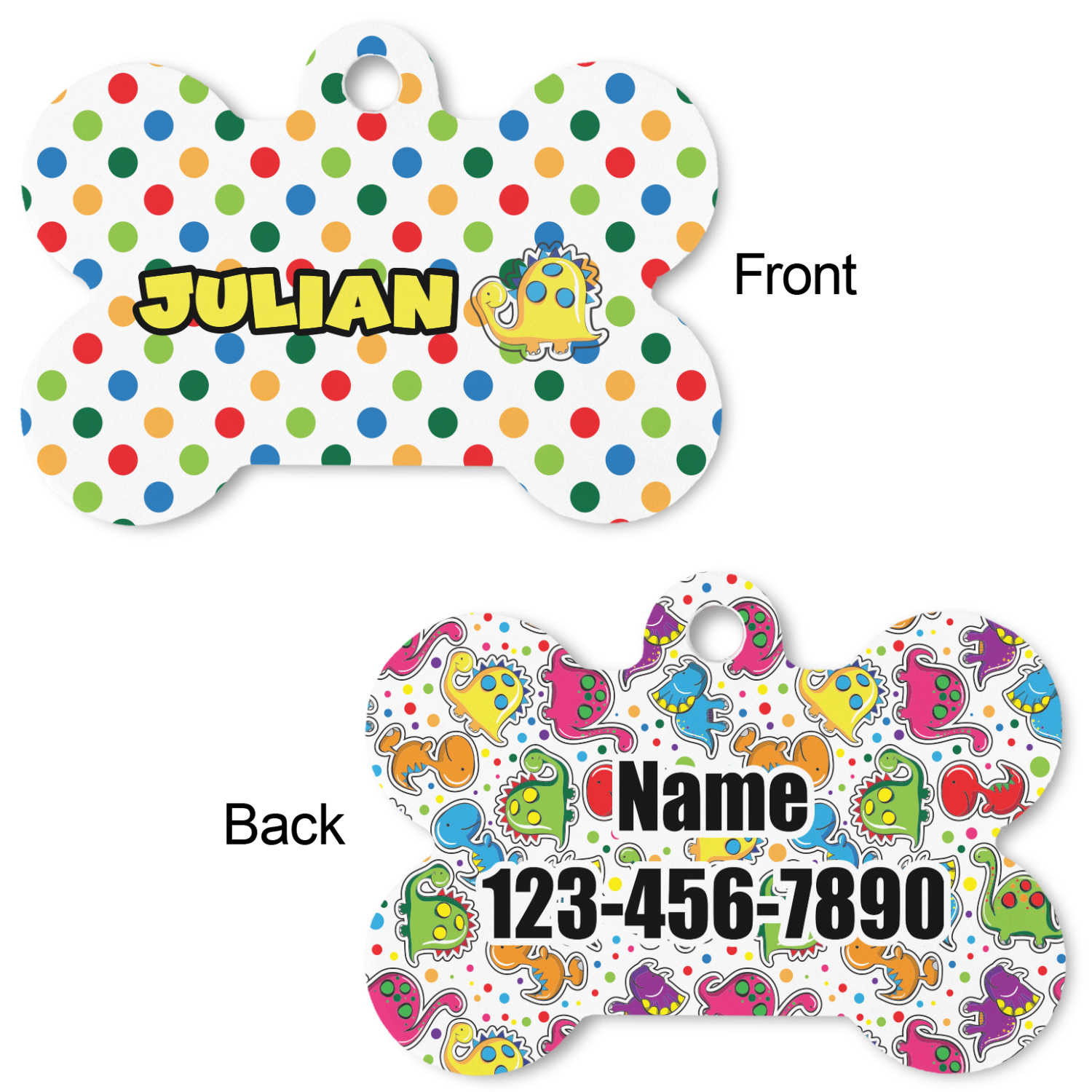 Our default design templates print your dog's personalization on the front and your contact information on the back; however everything is customizable, so you customize the patterns, the colors, the personalization, the contact information etc.