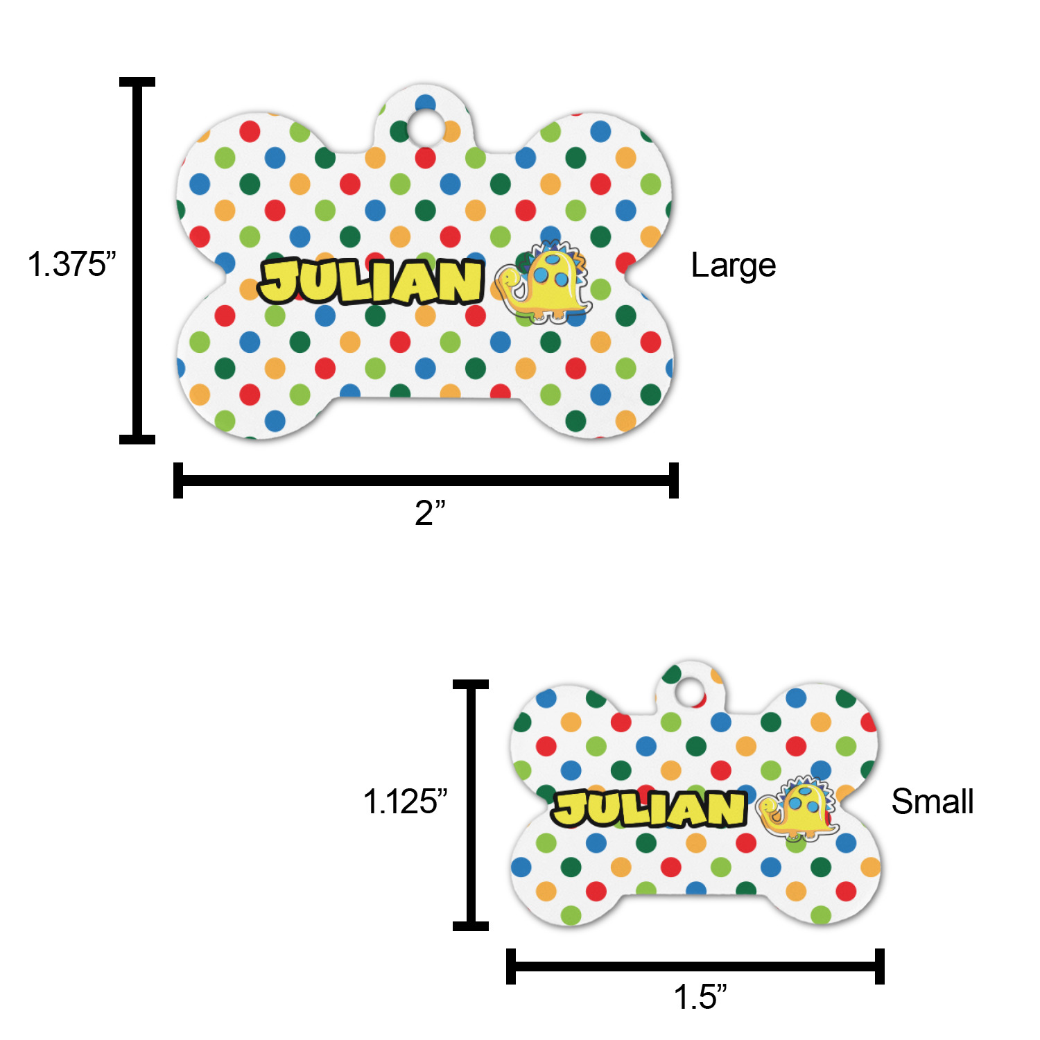 The small bone dog tag size is perfect to pair with our small dog collars, the large size pairs well with our large dog collars.