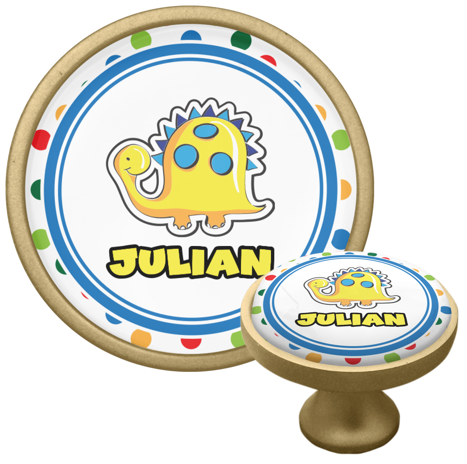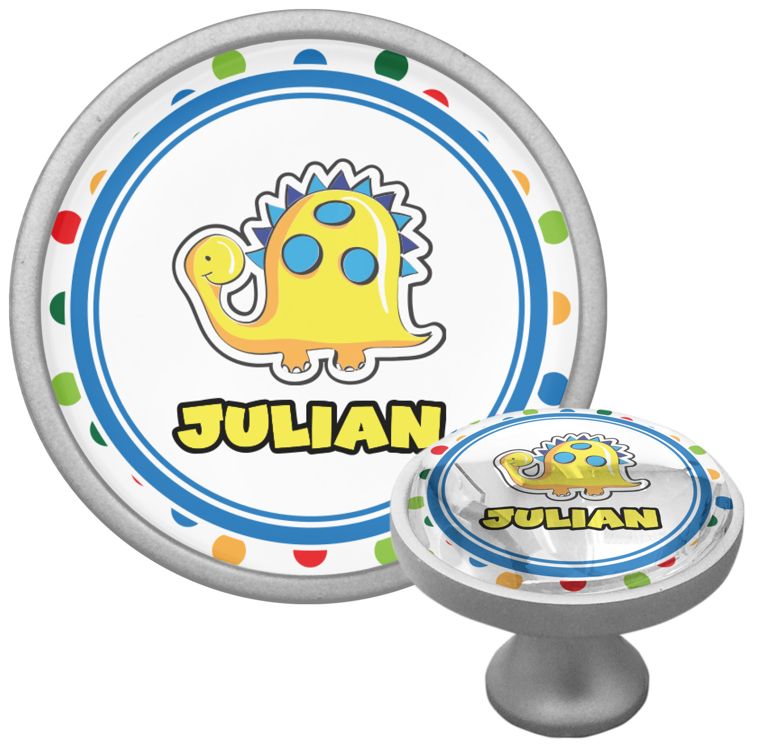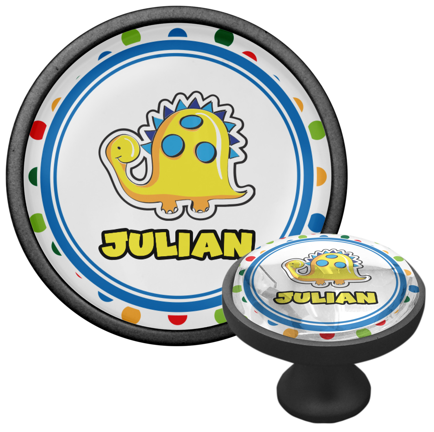 We sell these cabinet pulls in two different colors to better match your room's color scheme. We offer an oil-rubbed bronze base that is black in color, and a satin nickel option, which has a silver color. Your design is displayed across a high gloss vinyl insert that is placed on top of these cabinet handles. We then place a 1 inch thick glass cabochon atop the design, which seals the cabinet knob and makes the colors of your customization stand out. These custom cabinet knobs are approximately 1.3 inches in diameter. Your purchase includes a 1 inch screw that can be used to mount the knob to any cabinet in your home.