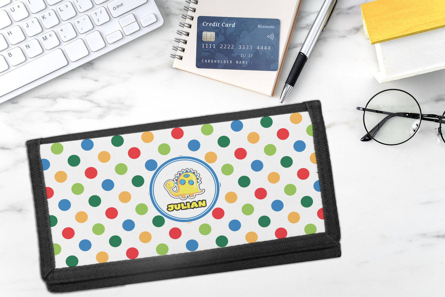 The checkbook cover is made of a durable canvas and the front flap is decorated with a vibrant design of your choosing. With 4 slots for credit cards or IDs, and 2 compartments for your checkbook register, cash, receipts, business cards, and more; this checkbook cover could easily double as a wallet.