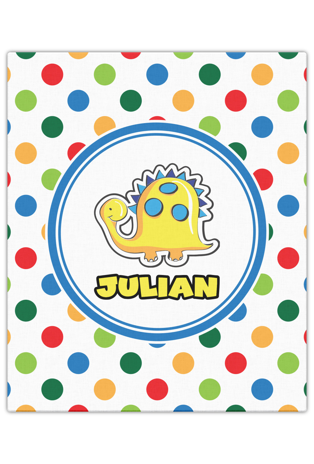 A white label trimmed in coordinating blue showcases a cute yellow dinosaur. Add personalization of your choice for this special pattern.