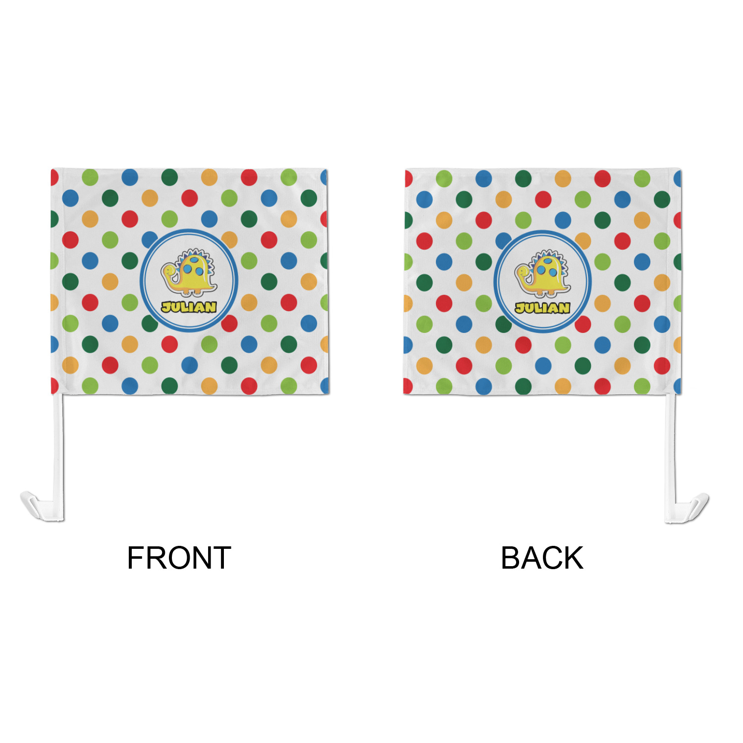 Our personalized flags are made from a durable, yet lightweight cloth that will proudly bear your logo or design of choice, while withstanding the outside elements. We have two size options - 8" x 11" and 11" x 15". Both come with a flag pole which includes a clip that secures the pole to the side window, whether it is rolled up or down. The flags are printed on both sides to display your design from all directions.