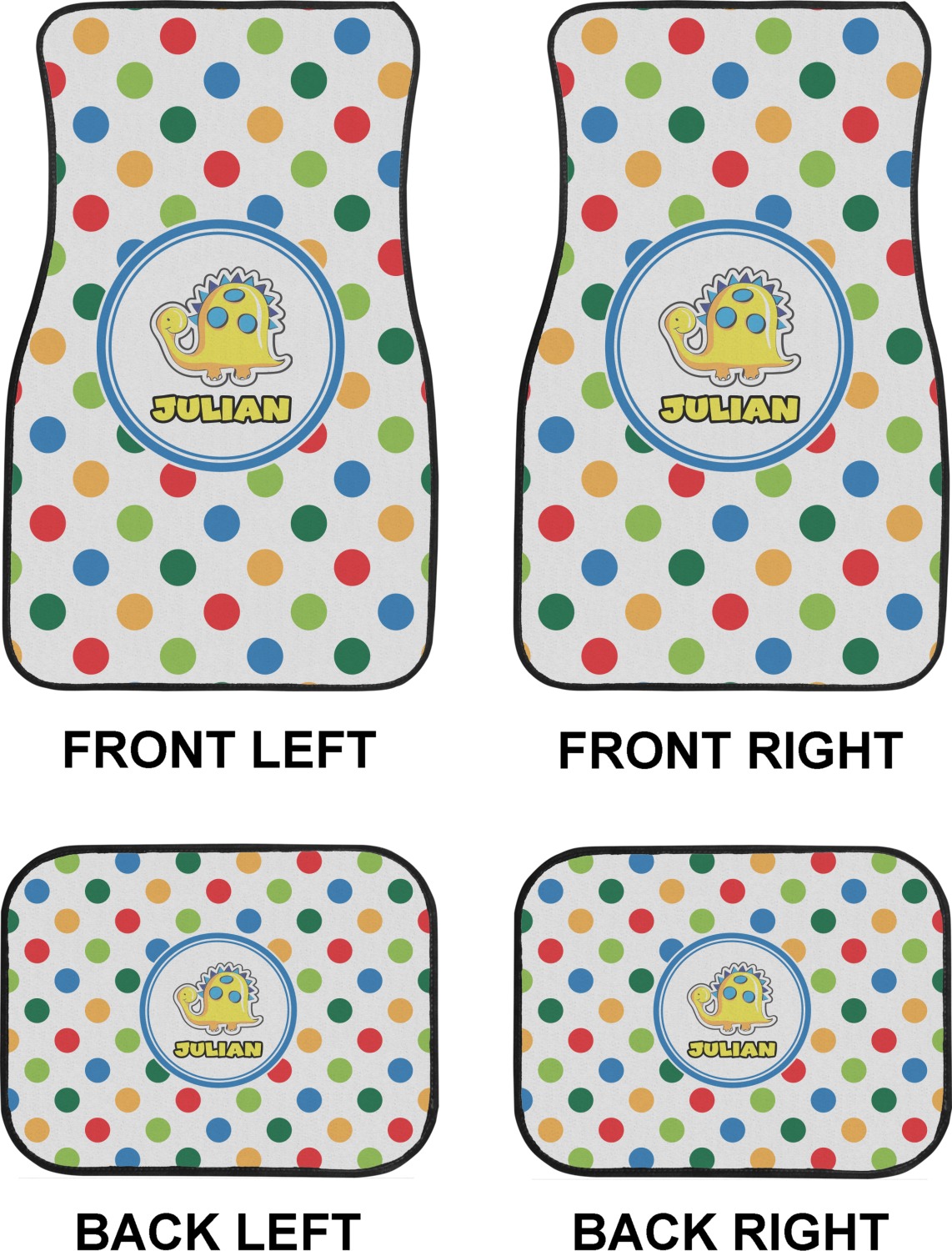 We craft our auto floor mats mats from polyester, apply a black finish to the edges, and lined at the bottom to prevent slippage. These mats protect your floors from grass, mud, and any accidental spills. We display your personalized design on the front face of each mat. The sizes of these car floor liners are standardized to provide a versatile fit for all vehicles. The front rows car mats measure at 17 by 26.5 inches, while the back rows measure at 17 by 13 inches. We sell three packages of car floor mats. You can purchase a pair of front row car mats, a pair of back row car mats, or a set of front row and back row car mats. To make an informed purchase, we recommend measuring the surface area of your car floors.