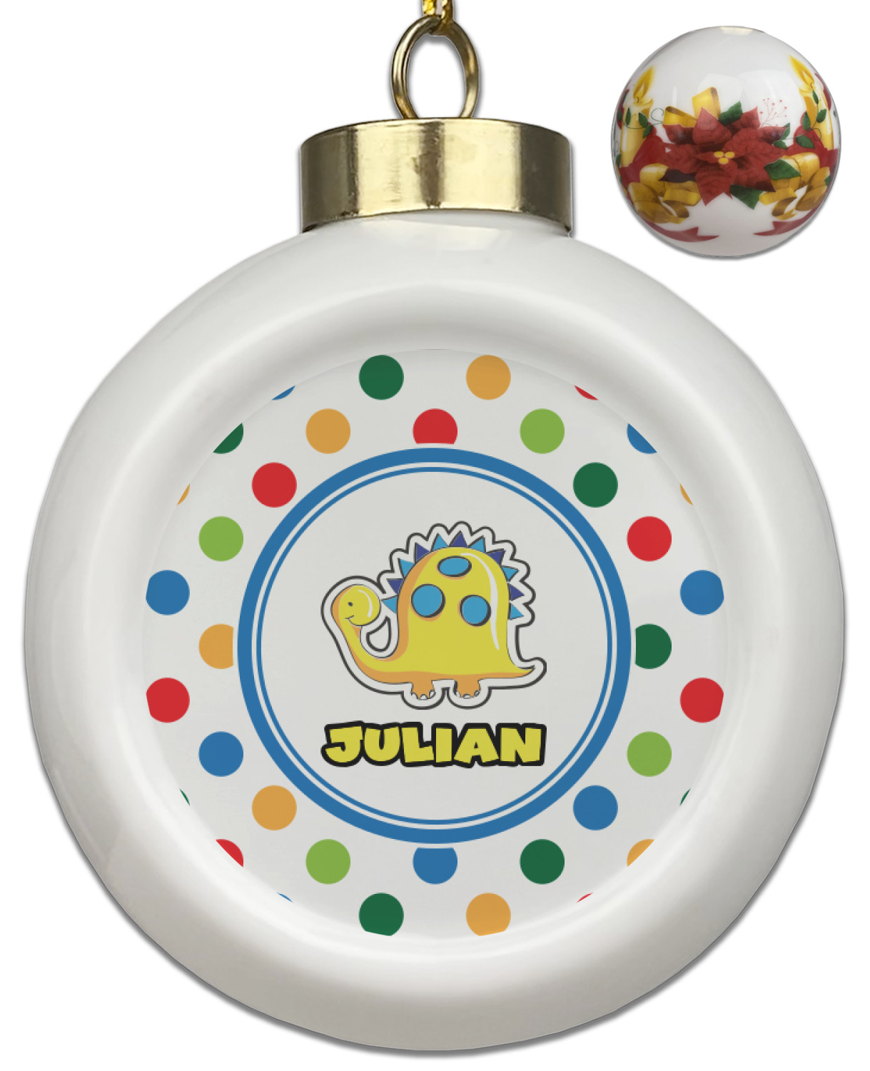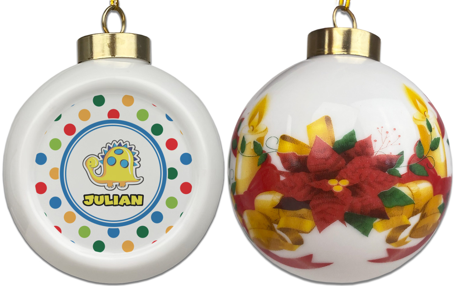 Our Christmas ornaments are a unique ceramic ball shape with a twist as it has a flat face to display your custom design! Select from one of our two design types - Christmas Tree or Poinsettia Garland - to adorn the curved back of your personal design. Each ornament measures 3H x 2.5W x 2D accompanied with a gold string accent for finishing touches to hang on your beautiful Christmas tree!