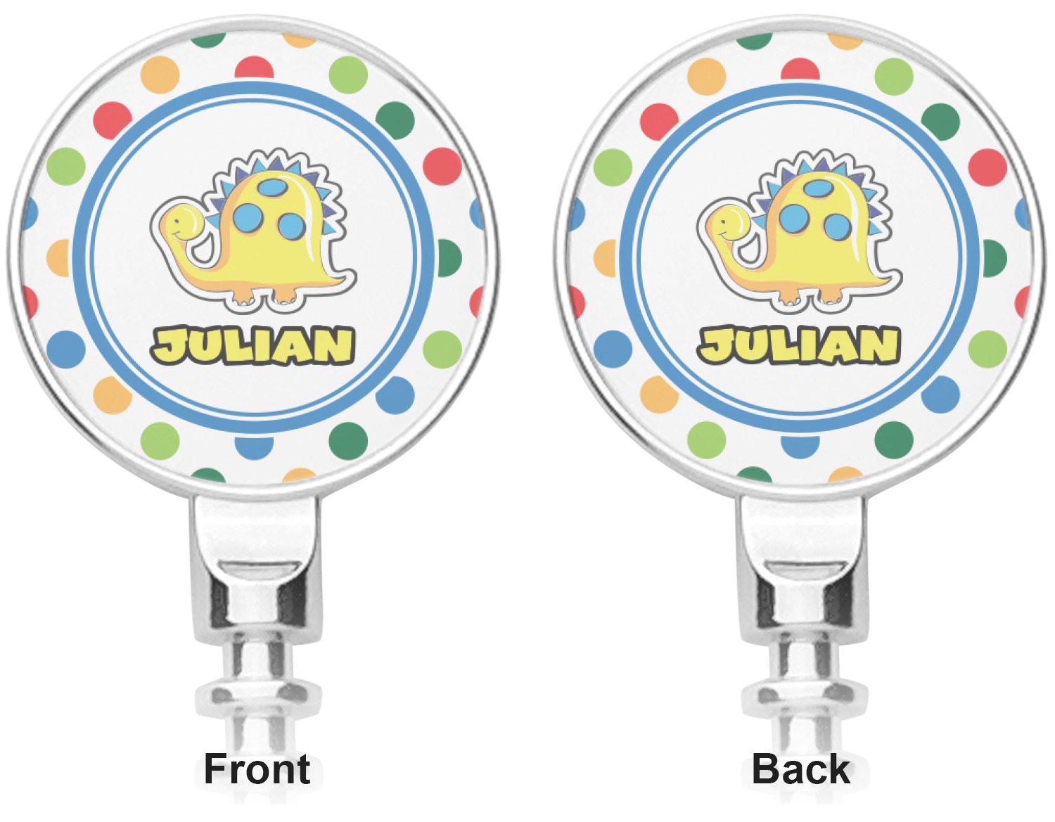 A white label trimmed in coordinating blue showcases a cute yellow dinosaur. Add personalization of your choice for this special pattern.