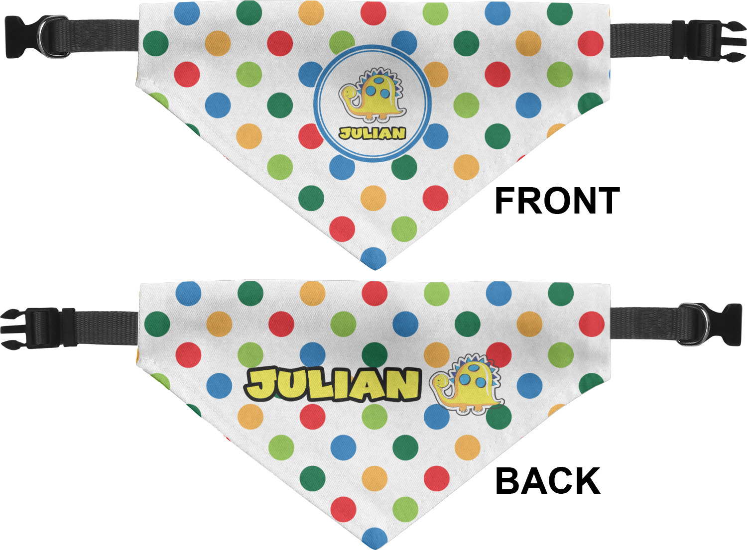 We print the front and back of these dog bandanas with your customized design. The bandana itself is made from a durable polyester, sewn together with a gap large enough to accommodate any collar. Regardless, the bandana includes a plain black, canvas collar with plastic snaps, that can easily be removed if desired. These dog bandana collars are available in four sizes: small, medium, large, and extra large. Please see our sizing chart for more information regarding the dimensions of each size.