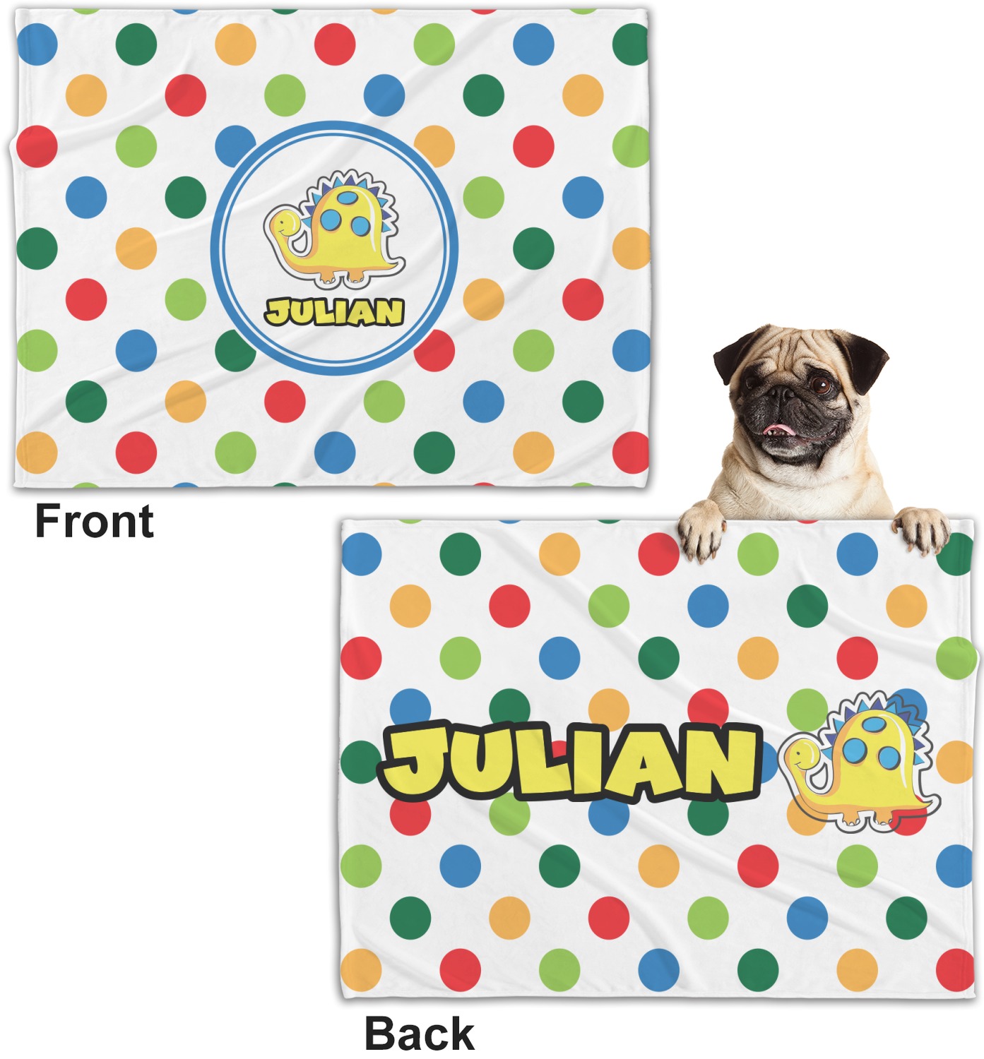 These dog blankets are crafted from a gentle, soft-to-the-touch, minky material. We print your customizations, either matching or differing, on both the top and underside of the blanket. These personalized dog blankets are available in two sizes: regular and large. Our regular size, at 40" x 30", accommodates small and some medium size dogs. At 60" x 50", our large dog blanket is a better fit for bigger breeds. Though specialized for dogs, these blankets still make a thoughtful gift for your favorite feline, or any other pet in mind!